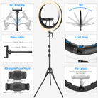 - 19-inch Large Ring Light & Sturdy Tripod Stand- 512 SMD LEDs give off great light (color temperature 3200K to 5600K, CRI 97+, TLCI 98+, 0%-100% brightness adjustable, 1% fine-tuning), perfect for the vlog, livestream, and selfie. The light ring tripod is made of aluminum alloy. Adjustable height ranges from 31.5 inches to 70.87 inches; a durable 3-leg stage design and solid locking system keep all of your equipment safe.