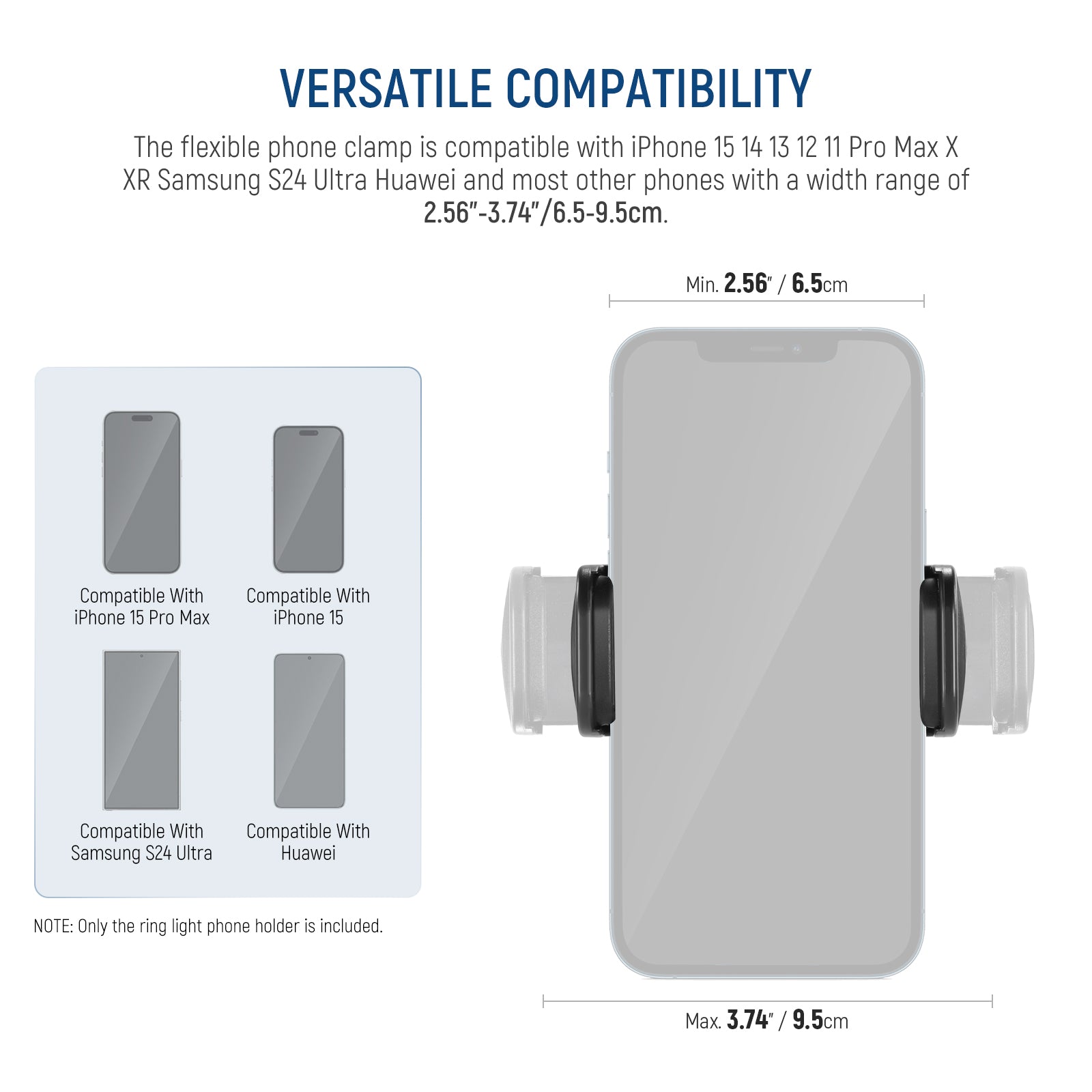 - Versatile Compatibility- NEEWER SP-09 phone holder for ring lights (compatible with NEEWER RP19C RP19H SRP18-2.4G RL45B ring lights) works for all cellphones with a width between 2.56"-3.74"/6.5-9.5cm, suitable for mainstream brands and models such as iPhone 15 14 13 12 11 Pro Max X XR Samsung S24 Ultra Huawei