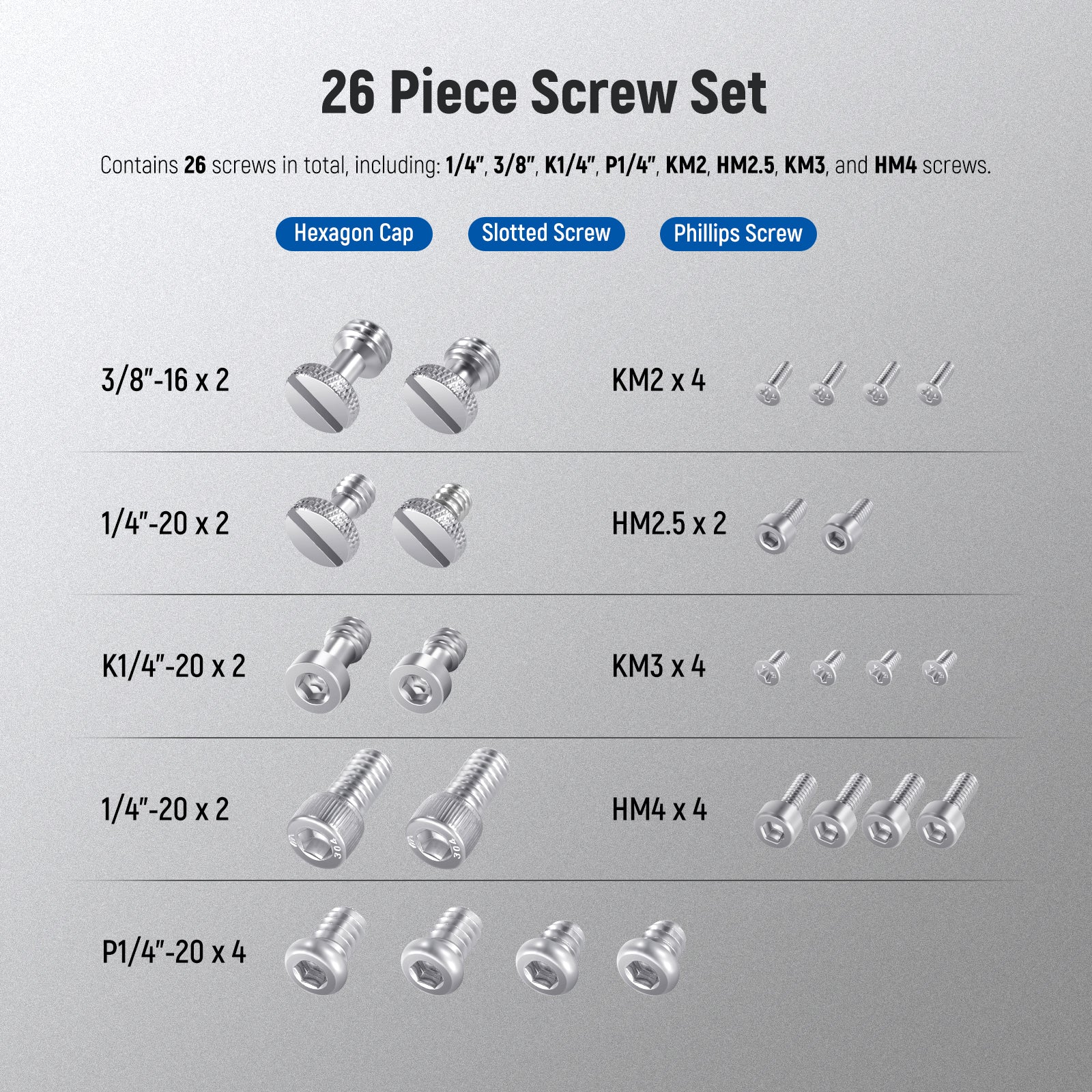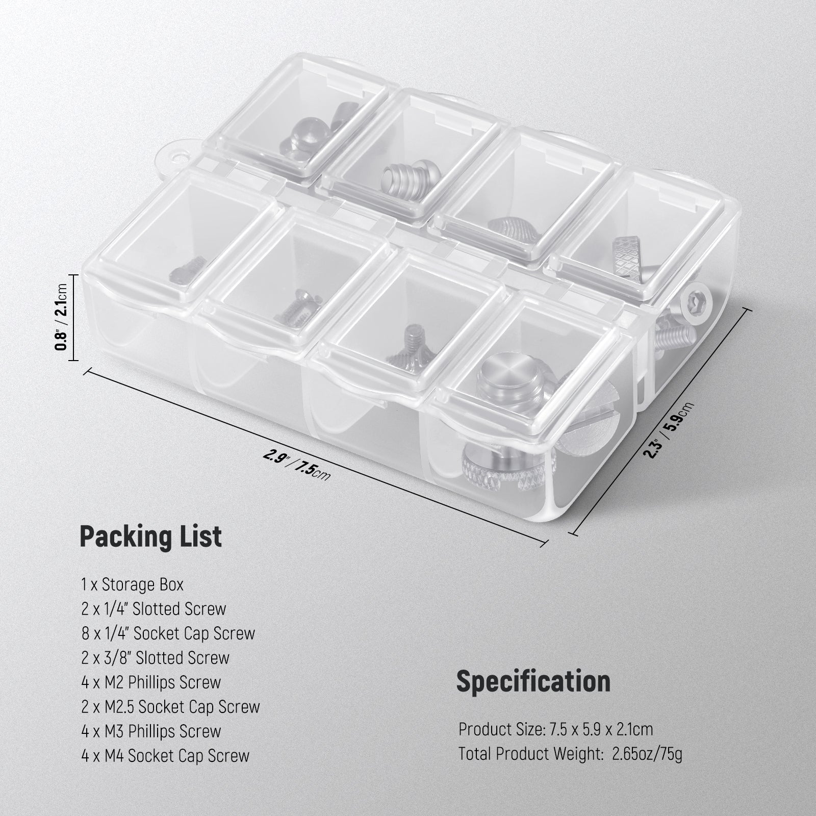 • Handy Photography Screw Set- Small camera accessories like screws get misplaced all the time. Get this camera mount screw set and always have spare screws at hand. Six kinds of screws included: 1/4", 3/8", M2, M2.5, M3, and M4 screws
