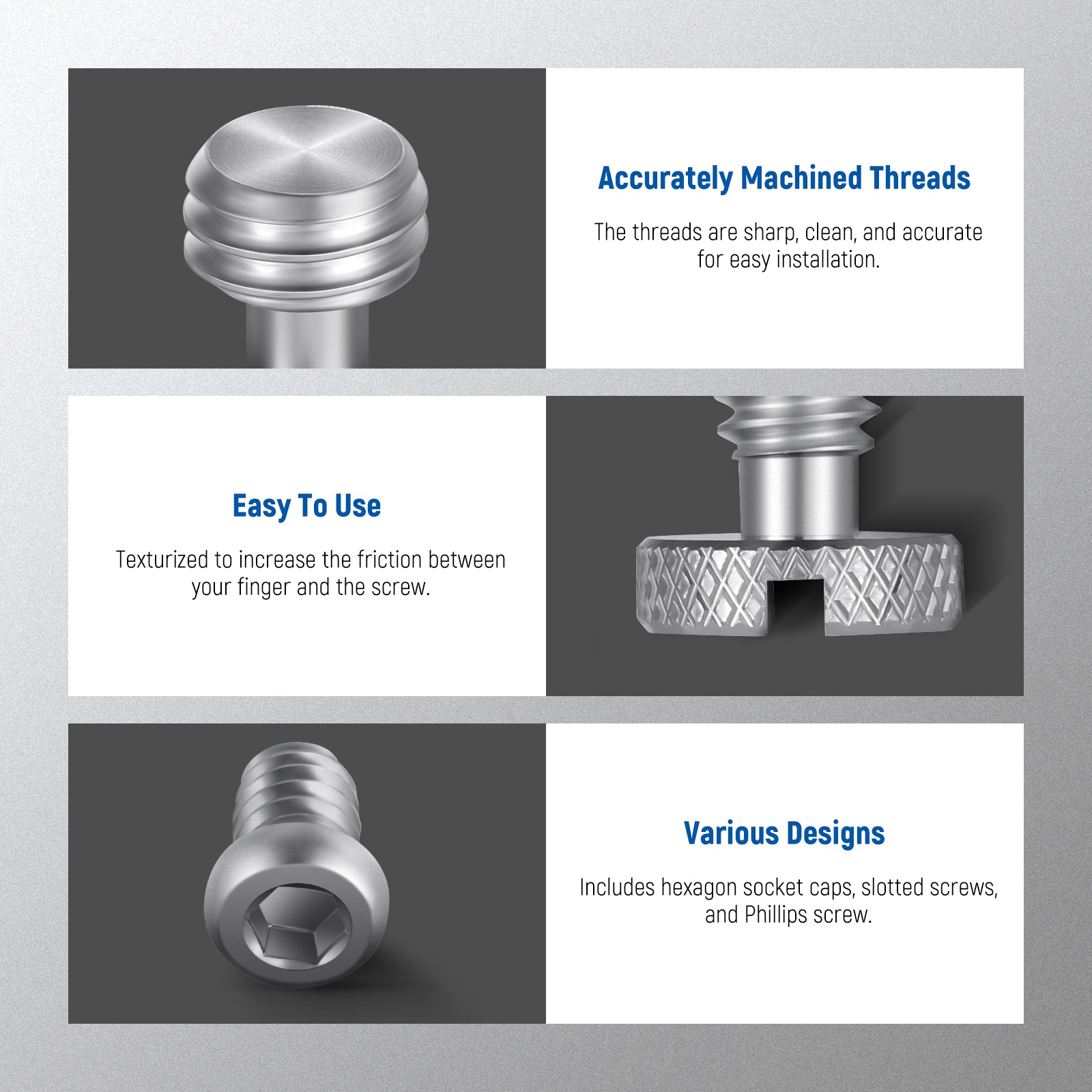 • Precise & Accurate Screw Size- With precise measurement and CNC machined technology, the screws of different specifications are built with accurate screw threads. Widely and perfectly compatible with phone cages, camera cages, camera top handles, quick release plates, and more