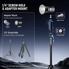 - 1/4" Screw Hole & Adapter Mount- Includes a 1/4" mounting head to securely connect your lighting equipment, while the 1/4" threaded hole at the bottom allows for easy attachment to a camera tripod or photography light stand, ensuring a secure setup and releasing your hands. A DC to DC cable and a USB C to USB C PD cable are contained for effortless connection with different devices (Lights/stand NOT included)