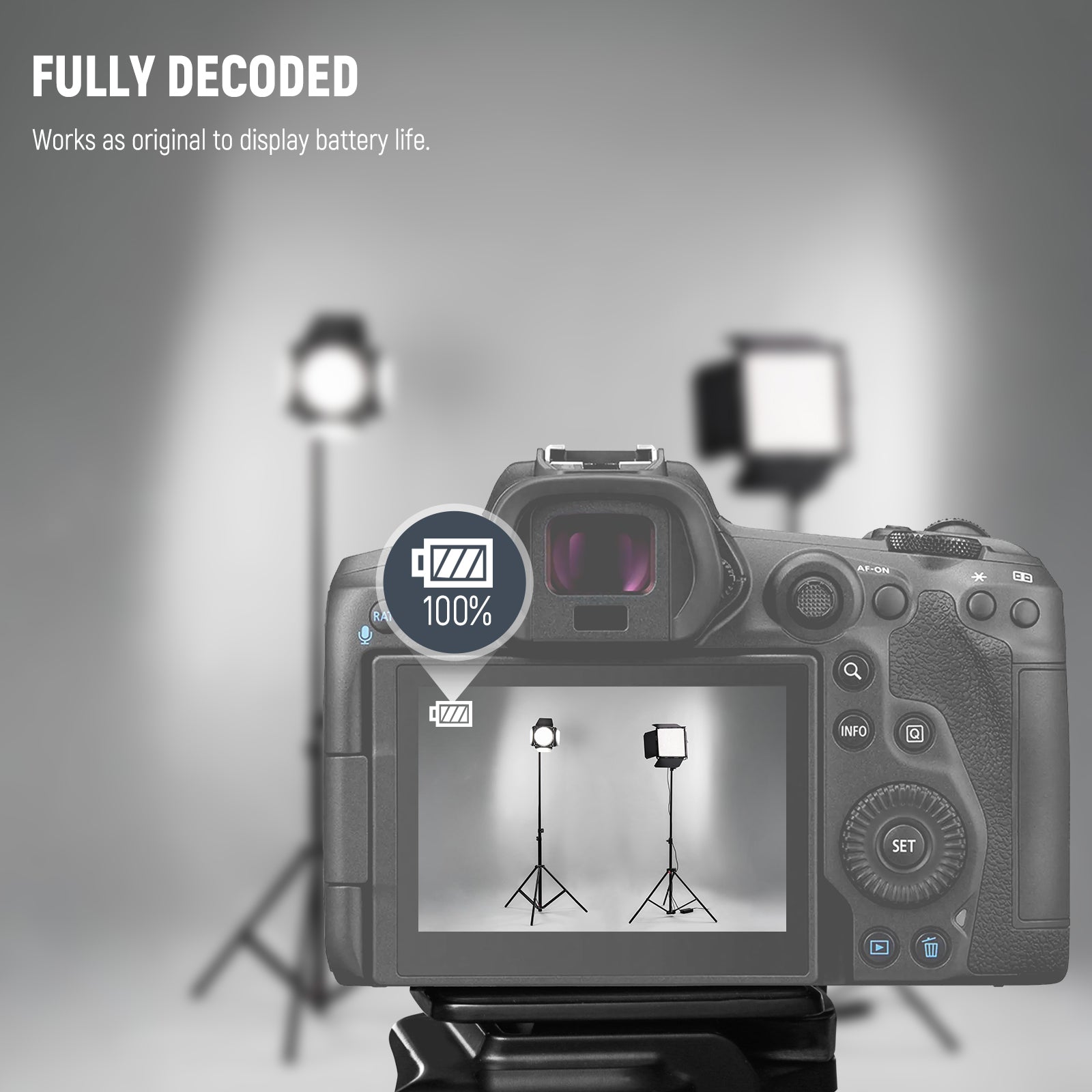 - 3.3H Fully Recharged via Type C- An integrated type C port allows effortless power supply via a portable charger, laptop, adapter, or car charger using the included charging cable. A full charge only takes 3.3H, and an indicator presents the charging status. Efficient to recharge, ensuring a reliable backup for your creative work on the go. Plus, it also supports in camera charging or with an LP-E6P charger (sold separately)