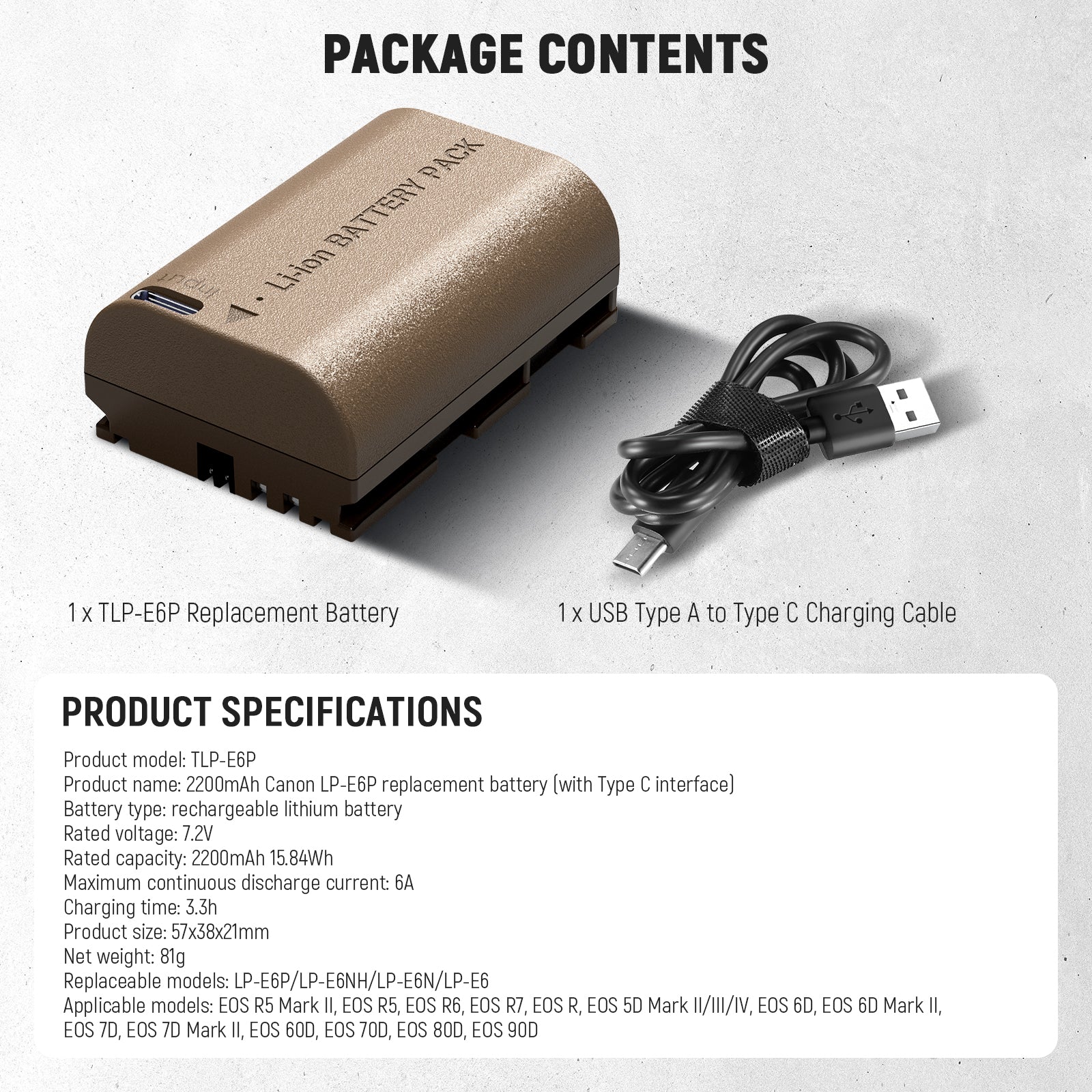 - Fully Decoded LP-E6P Replacement Battery- NEEWER TLP-E6P is a newly upgraded battery, fully decoded as a professional alternative to the original LP-E6P/LP-E6NH/LP-E6N/LP-E6 models. It features an impressive 6A max continuous discharge current, effortlessly powering the latest EOS R series, seamlessly compatible with Canon EOS R5 Mark II EOS R5 EOS R6 EOS R7 EOS R EOS 5D Mark II/III/IV EOS 6D EOS 6D Mark II EOS 7D EOS 7D Mark II EOS 60D EOS 70D EOS 80D EOS 90D cameras. Note: Fully discharge the battery before charging it for the first time.