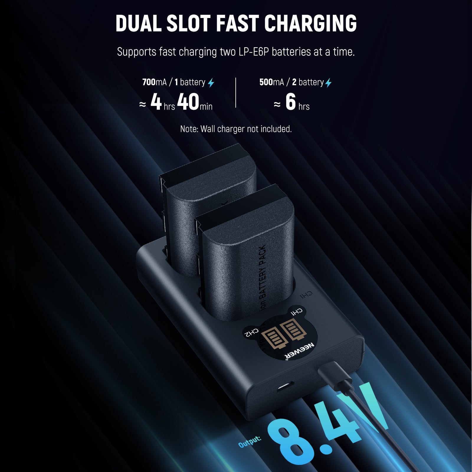 - Dual Slot USB Charger- This vertical USB charger can simultaneously charge 2 LP-E6P batteries to full capacity in just 6 hours, significantly improving your shooting efficiency (supports original/NEEWER LP-E6P/LP-E6NH/LP-E6N/LP-E6 batteries). It features Micro USB and Type C dual input ports, allowing charging from a portable charger, car charger, or computer using the included USB A to USB C cable. An LCD display provides real time charging status