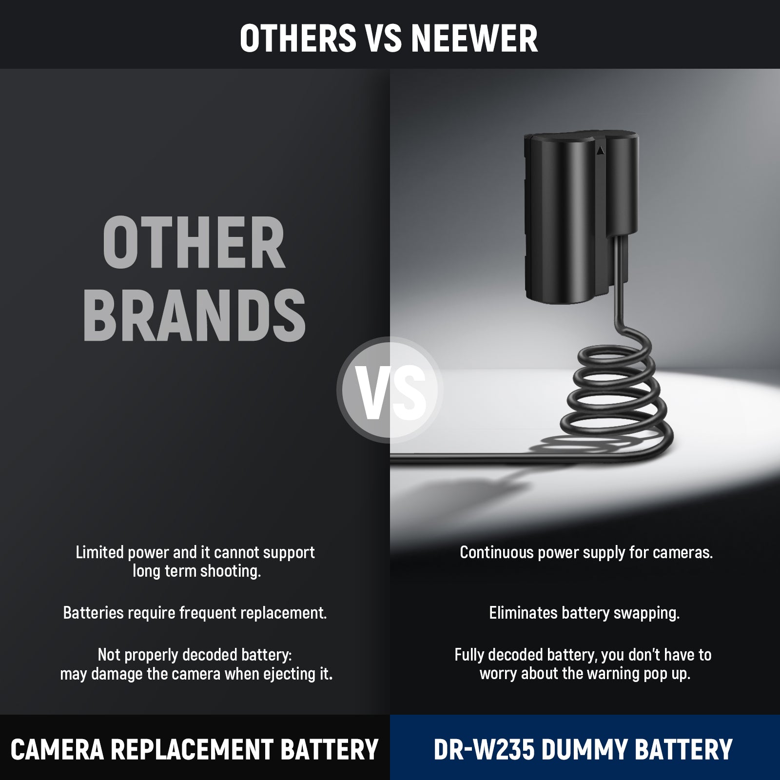 - Continuous Power Supply- Say goodbye to frequent battery changes! NEEWER DR-W235 replacement dummy battery coupler, replacing NP-W235 FUJIFILM batteries, connects directly to your camera's power input to ensures uninterrupted power for your device, bypassing the need for traditional batteries yet promising extended shooting sessions