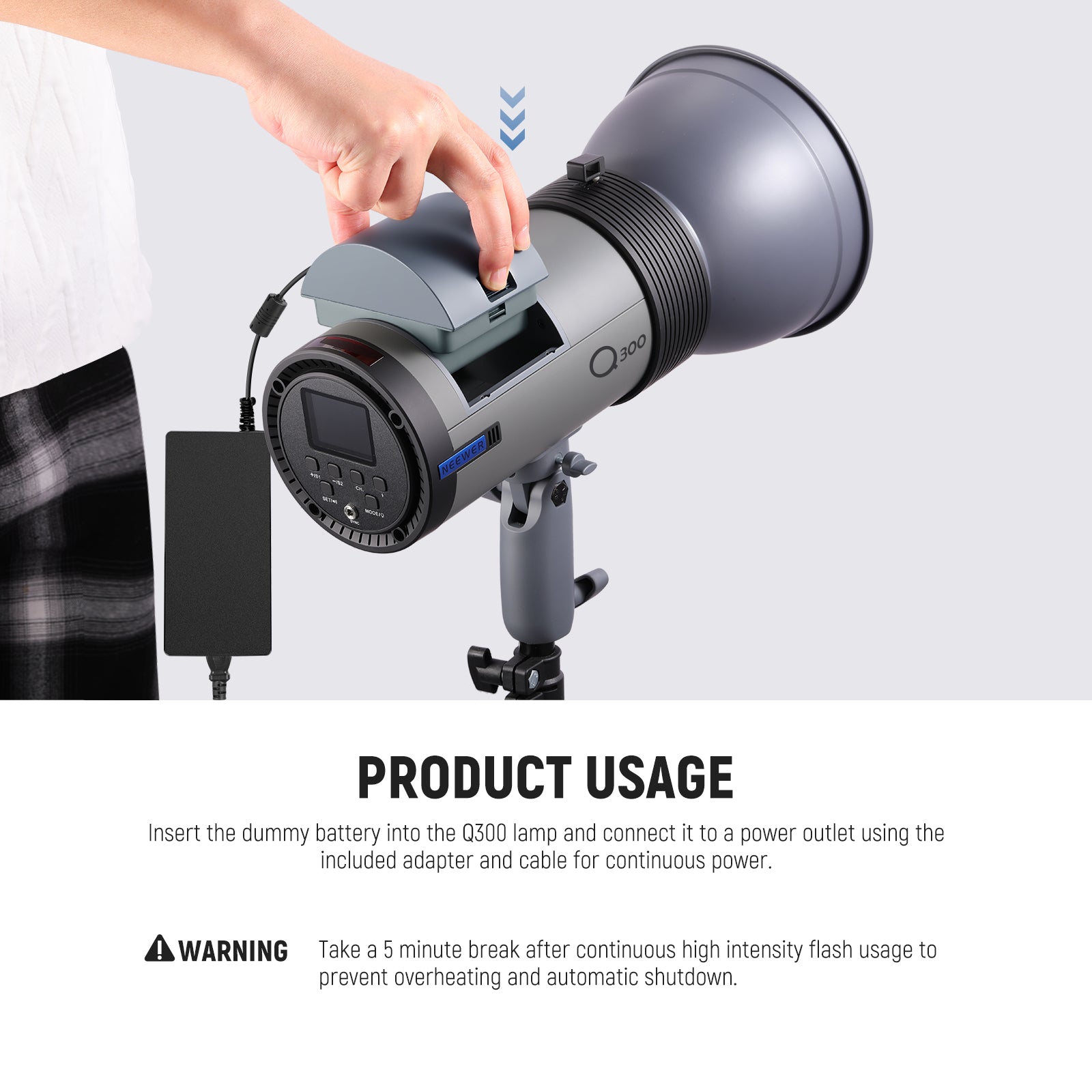 - Dummy Battery Kit for Q300- Fully compatible with NEEWER Q300 outdoor strobe flash, this NT-Q300 dummy battery kit continuously powers your flash, avoids the frequent battery replacement of the standard Q300 lithium battery via the included AC power adapter and cable, and is ideal for studio and indoor photography, vlogging, live streaming, and filmmaking