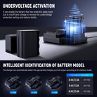 - Comprehensive Protection Designs- Each slot of the NPF battery charger is engineered with precision to ensure a tight fit with the charged battery, featuring a built in advanced circuit with overcurrent protection, securing safe charging. All sides are equipped with precise ventilation holes to prevent overheating during charging, and an incorporated fan will automatically turn on when the charging temperature exceeds 122℉/50℃