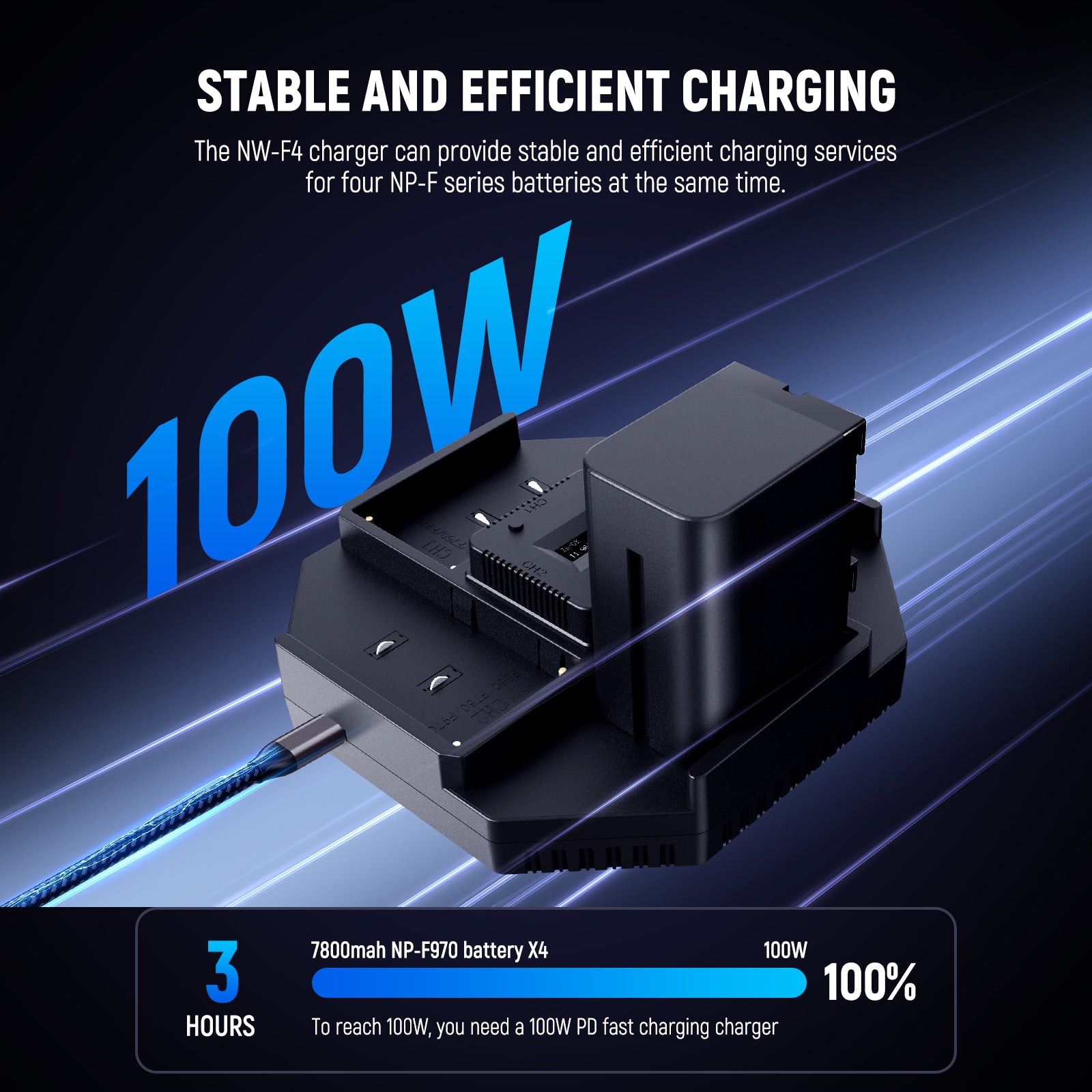 - 100W PD 4 Channel Fast Charging- The NW-F4 efficiently charges up to 4 NPF batteries simultaneously. It supports 100W PD ultra fast charging when used with a 100W PD charger (sold separately), having four 10500mah NP-F970 batteries fully recharged in 4.5H, or four 7800mah NP-F970 batteries in 3H. Note: To achieve full power output, it’s highly recommended to use a 100W PD charger or higher. A 100W PD USB C to USB C fast charging cable is included