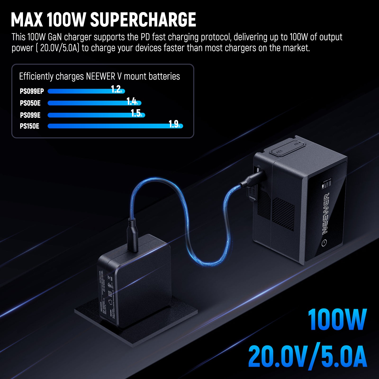 - Max 100W Supercharge- This 100W GaN charger supports the PD fast charging protocol, delivering up to 100W of output power ( 20.0V/5.0A) to charge your devices faster than most chargers on the market. Also provides additional outputs: 5.0V/3.0A, 9.0V/3.0A, 12.0V/3.0A, and 15.0V/3.0A, meeting the charging needs of various devices. Moreover, it efficiently charges NEEWER V mount batteries, fully charging PS050E in 1.4H, PS099E in 1.5H, PS099EP in 1.2H, and PS150E in 1.9H