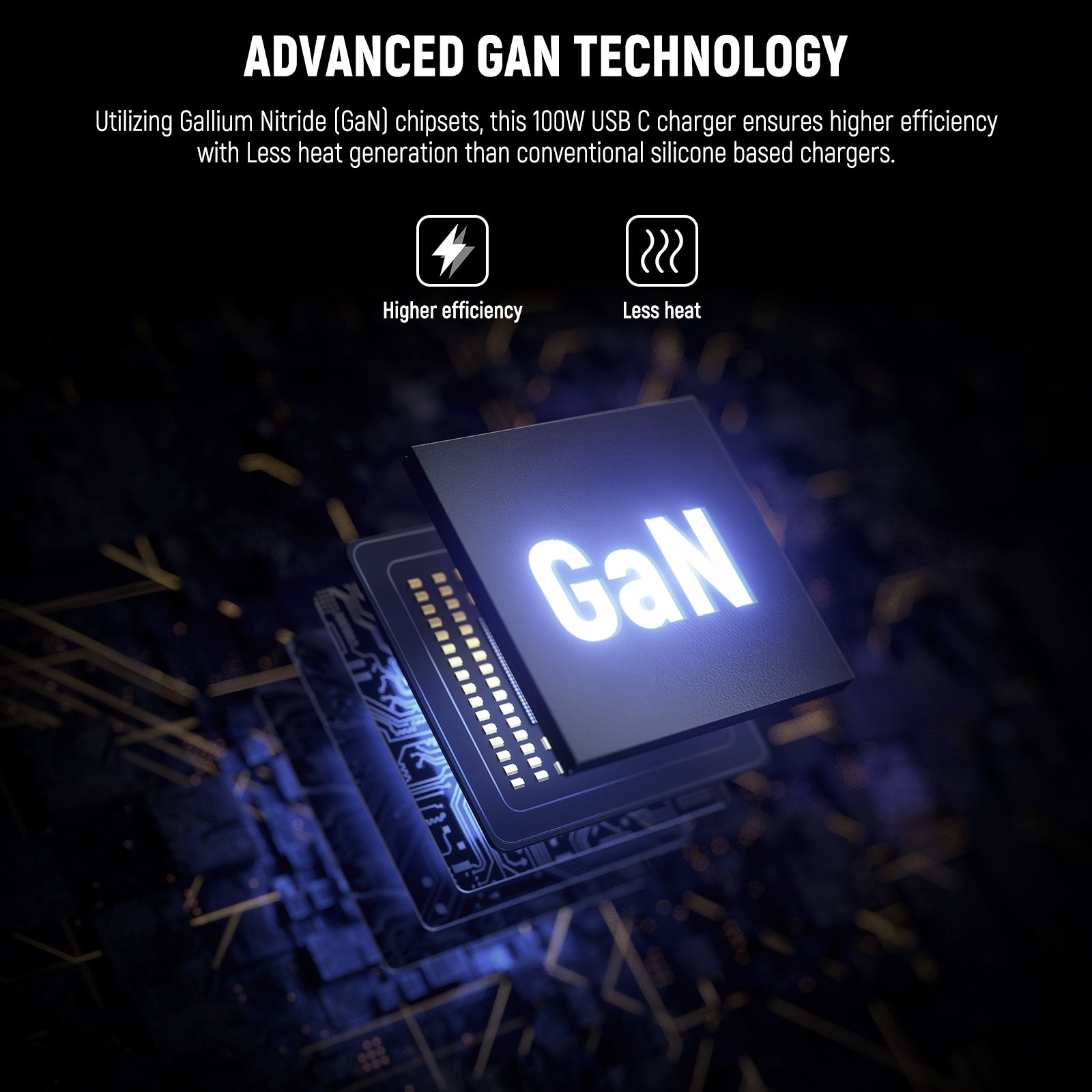 - Advanced GaN Technology- Utilizing Gallium Nitride (GaN) chipsets, this 100W USB C charger ensures higher efficiency with lower heat generation than conventional silicone based chargers. Compact and efficient, it is perfect for home, office, or on the go charging needs