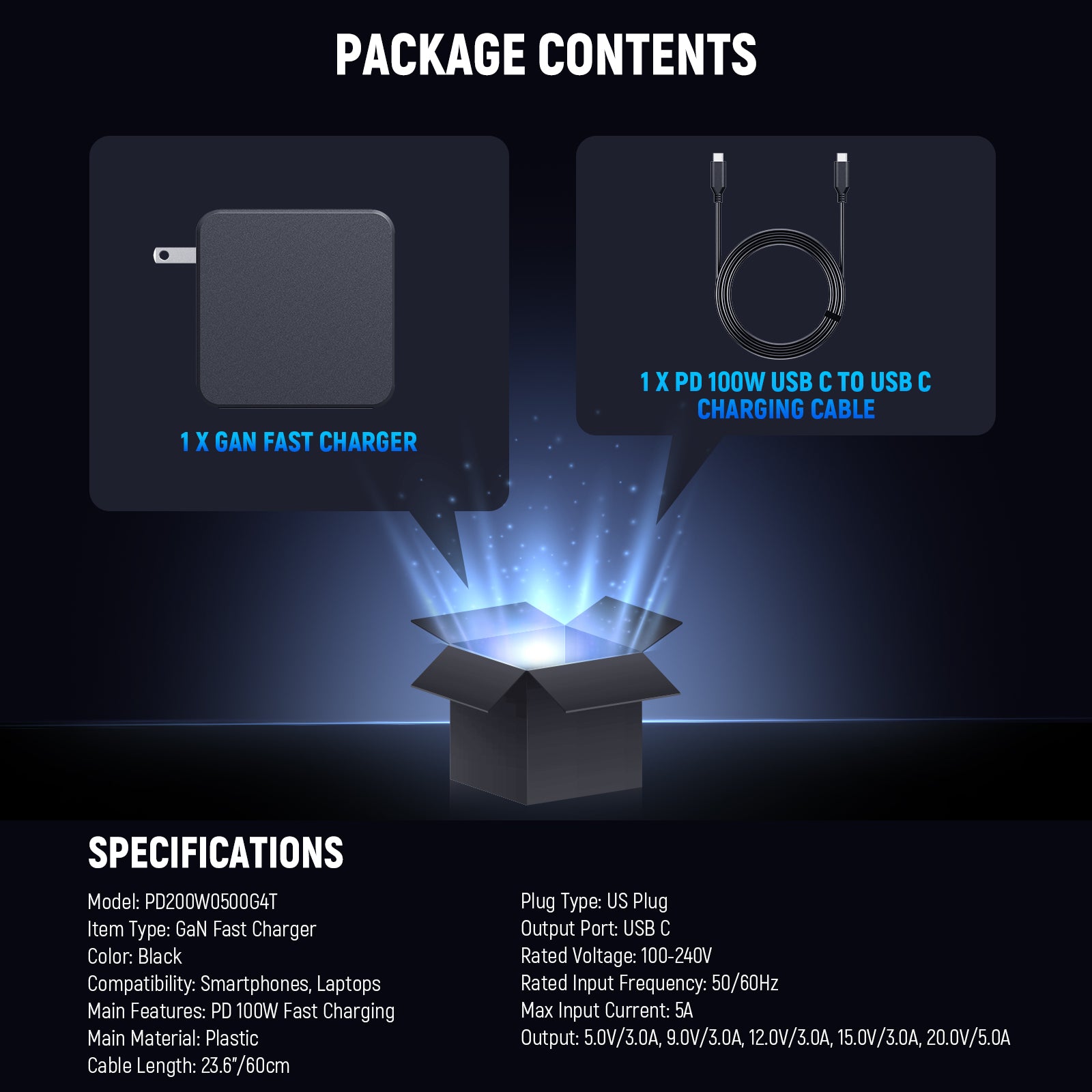 - PD 100W Fast Charging Cable- The GaN power adapter comes with a USB C to USB C fast charging cable, 23.6"/60cm in length, which offers efficient power delivery right out of the box, capable of quickly powering laptops, tablets, smartphones, and more