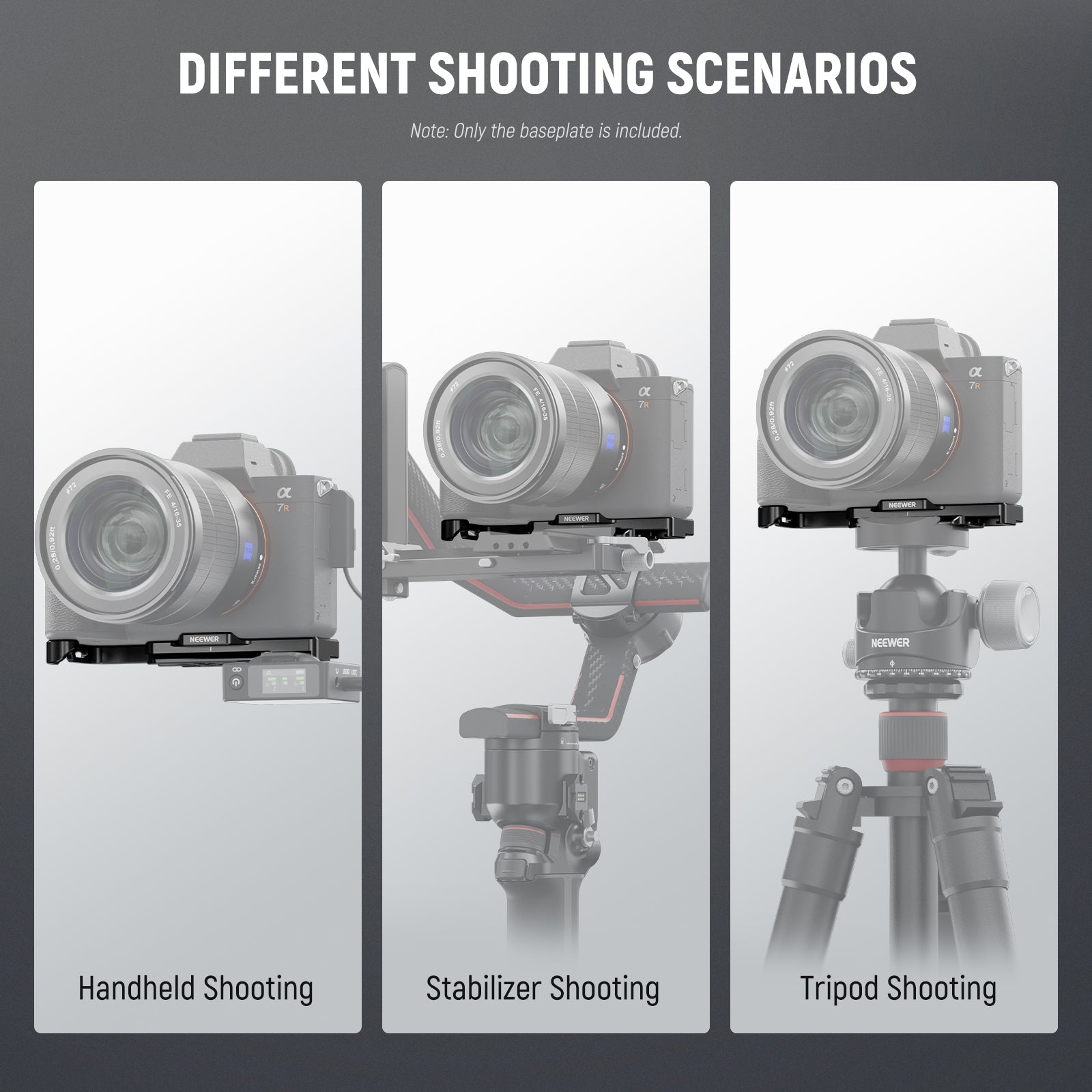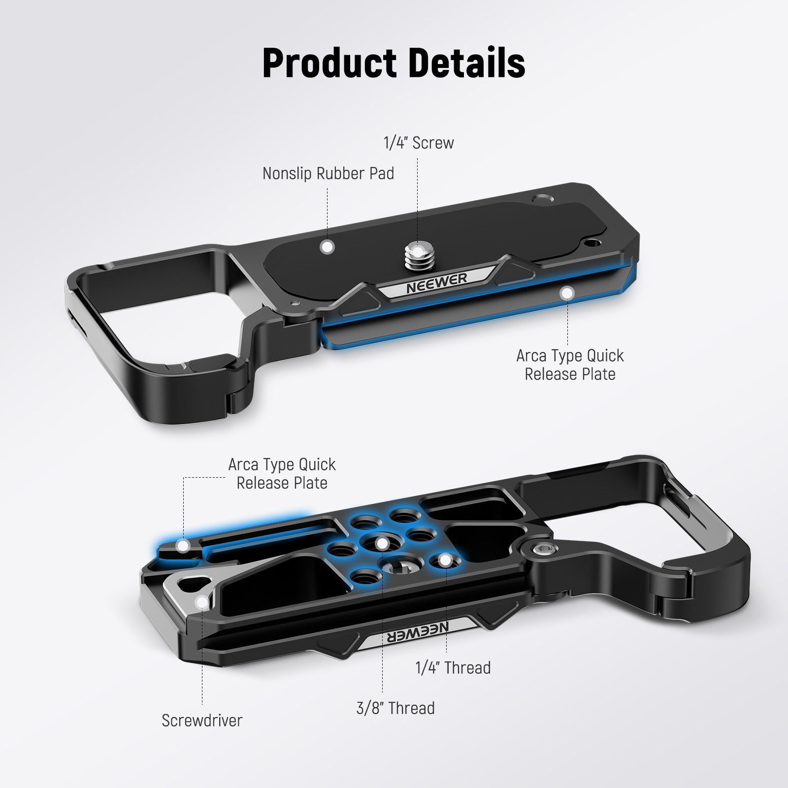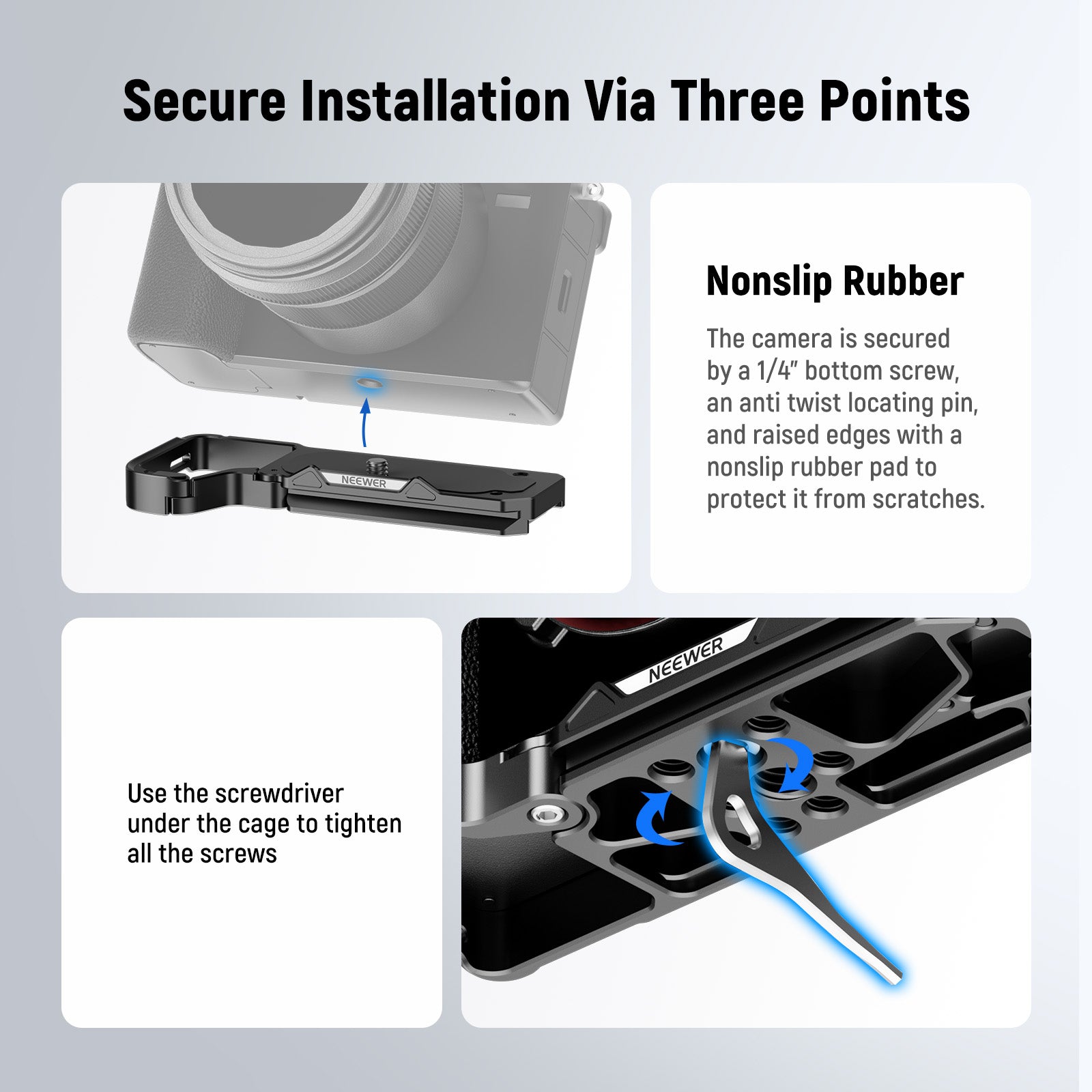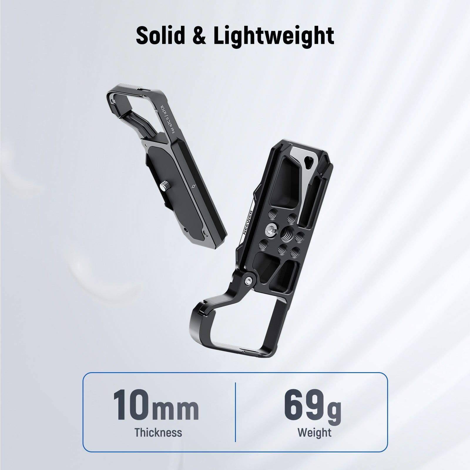 NEEWER offers camera cages, which provide thorough protection and effortless handheld shooting experiences. In addition, our collection includes camera grips and camera baseplates. These camera cages and grips can keep all buttons fully accessible. They are lightweight yet reliable protection. Choose a professional and suitable camera cage, grip, or baseplate.