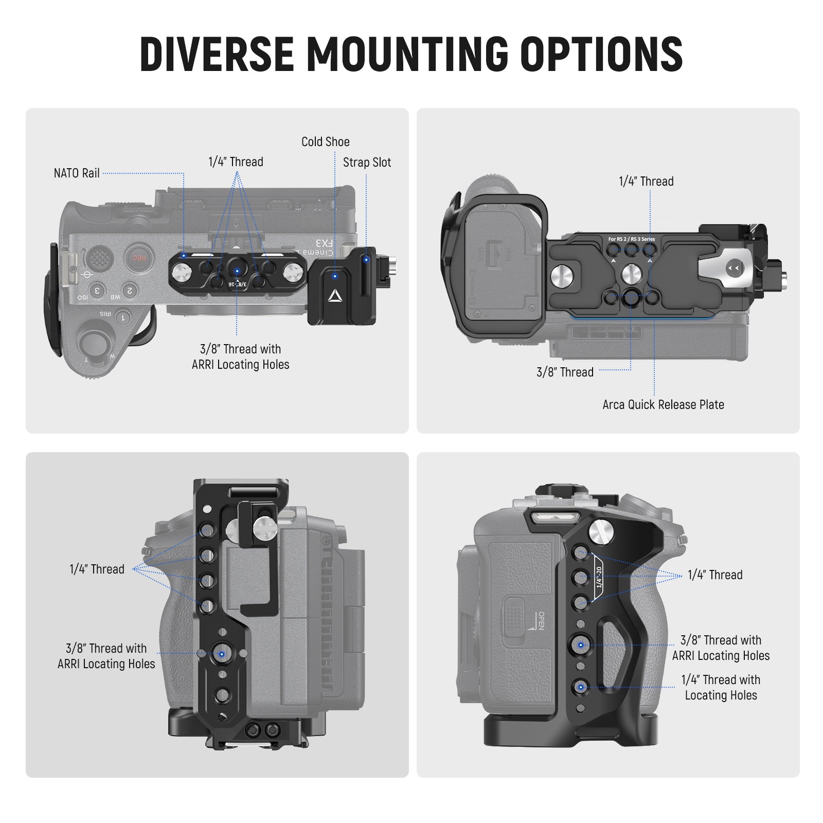 Photographers and videographers commonly rely on camera cages to secure gear such as microphones, external monitors, lights, top handles, follow focus systems, or battery packs. Most cages offer multiple 1/4"-20 and 3/8"-16 threaded holes, cold shoe mounts, and NATO rails for maximum flexibility and setups - especially essential in professional video production, where compact handheld or shoulder-mounted rigs must be adjusted quickly to create seamless productions.