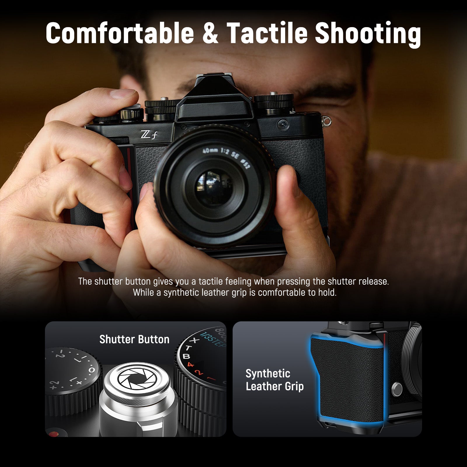 - Compatible with Nikon Zf Camera- Compatible with Nikon Z f, this retro baseplate is an homage to the classic film camera era. It attaches to the camera via a 1/4" screw and keeps the battery compartment fully accessible. An elegant silver aluminum shutter button blends seamlessly with the camera body and brings a more tactile feeling