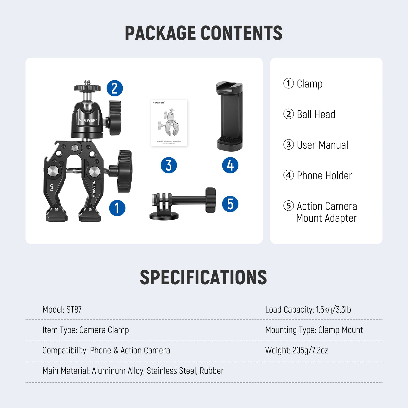 • Solid & Durable Material- Made of solid aluminum alloy, it is durable and versatile. It will stay tightly in your fixed position whether for work shooting or outdoor sports. The rubber pad inside the clamp enhances the grasp strength of clamp. The maximum load is 3.3 pounds (1.5KG)