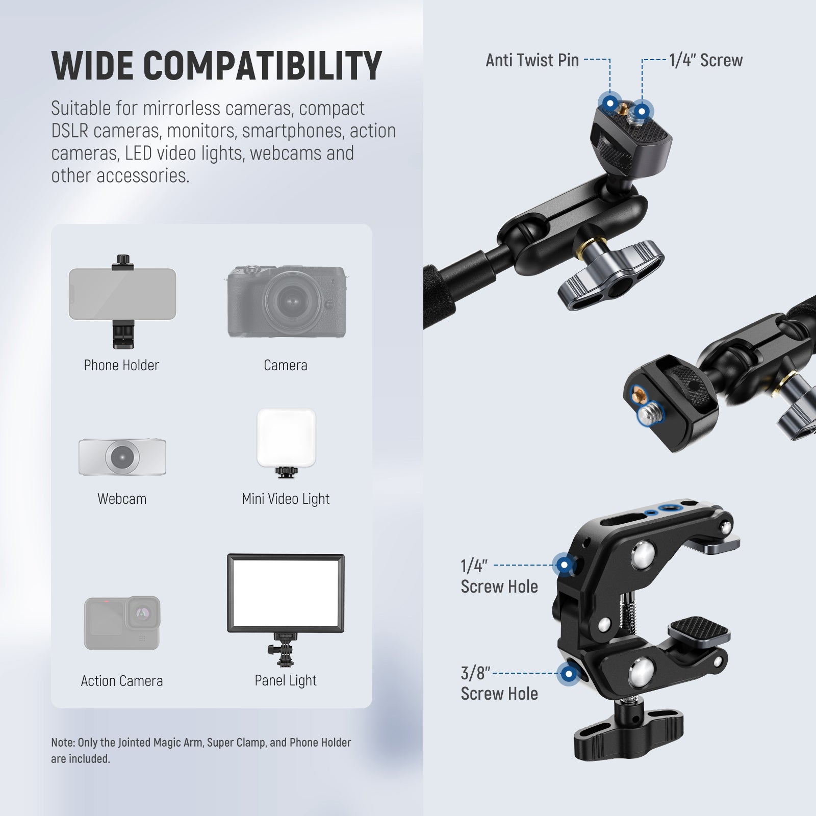 - Magic Arm with Super Clamp- Crafted from robust aluminum alloy, the magic arm camera mount supports mirrorless cameras, action cameras, webcams or smartphones up to 500g/17.6oz, double that of the counterparts, with an extra phone holder included, making it a versatile mounting solution for overhead shots, vlogging, live streaming, video conferencing, and other photography and videography. Recommended for use in static situations