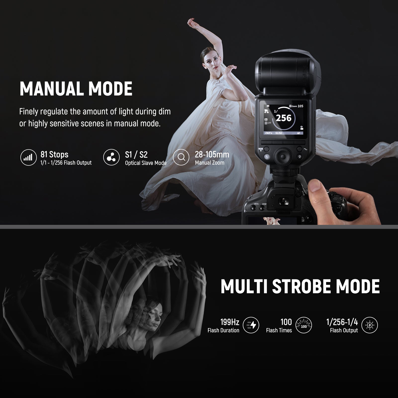 A lightweight camera flash is perfect for wedding photography as it allows easy maneuverability during extended shoot sessions. Holding and using it are also more comfortable, particularly when combined with other gear. In addition, you need to focus on flash capability.