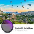 - Variable ND Filter- This ND2-32 Variable Neutral Density Filter reduces the light that enters the camera and allows you to shoot with slower shutter speeds and wider apertures in different light conditions, perfect for capturing rivers, waterfalls, light trails, and other moving subjects with dynamic motion blur