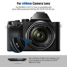 - For Ø49mm Thread Camera Lens- Verify your lens thread size before placing an order. Compatible with NIKON AF-S DX NIKKOR 55-200mm f/4-5.6G ED VR II or 35mm f/1.8G; Compatible with CANON RF 35mm f/1.8 is Macro STM, EF-S 24mm f/2.8 STM, EF-M 55-200mm f/4.5-6.3 IS STM or 30mm F1.4 Contemporary DC DN; Compatible with Sony E SIGMA 30mm F1.4 Contemporary DC DN FUJIFILM XC 15-45mm f/3.5-5.6 OIS PZ or XF 35mm f/1.4 R, etc. Note: An additional adapter ring is required for lenses with different diameters