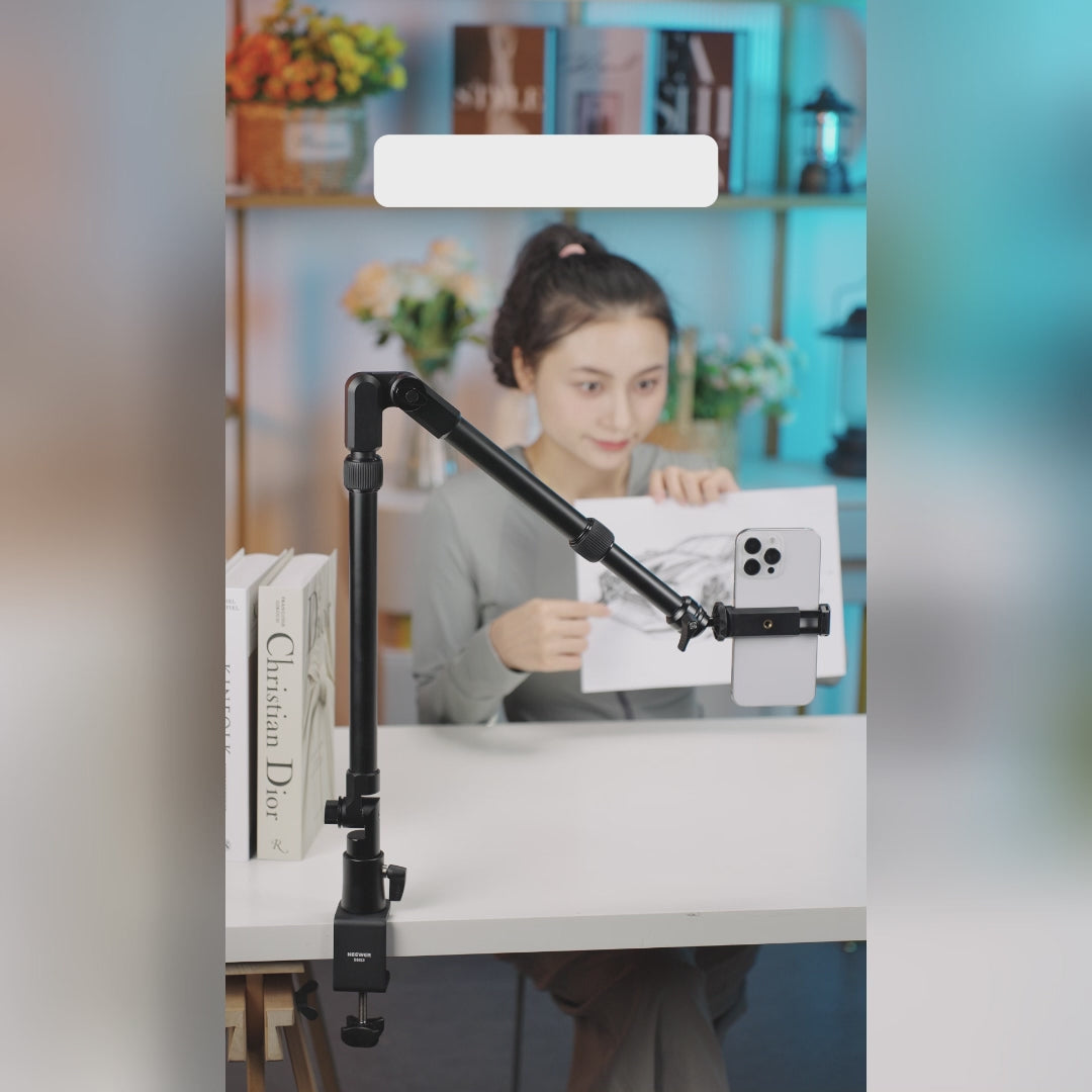 - Quick Setup- The articulating arm comes assembled and ready to use. Simply mount the C clamp onto a desktop up to 1.97"/5cm thick, connect it to the boom arm, and lock it securely. Then attach your camera or action cameras (compatible with DJI Osmo Pocket 3 2 Creator Combo Insta360 X5 X4 X3 Insta 360 Ace Pro Go 3S) via the 1/4" screw, or secure your smartphone in the phone holder