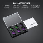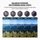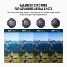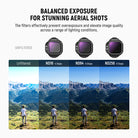 • Flexible Exposure Control- ND8, ND16, ND32, ND64 neutral density filters reduce light by 3, 4, 5, 6 stops respectively to prevent overexposure in different conditions and let you capture rivers, waterfalls, and light trails with dynamic motion blur