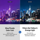 - Premium Natural Night Filter- When filming at night, light pollution from streetlamps, lights at home and business, neon signs, billboards, and other artificial lighting can be a real headache for photographers. Get this light pollution reduction filter to reduce the yellow/green color caused by city lights, capture details of your filming subject, keep proper contrasts, and avoid overexposure