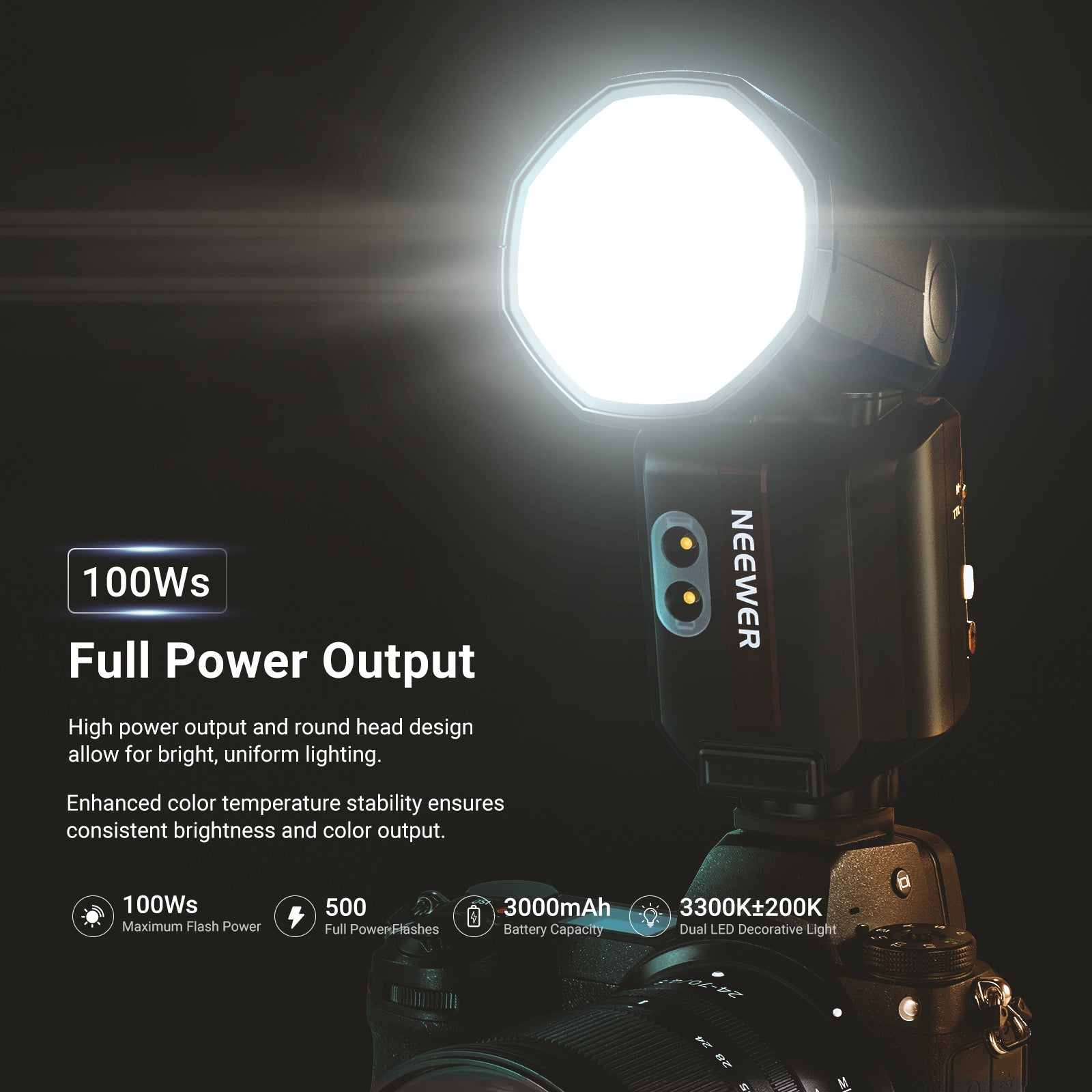 - 100Ws Professional Speedlite- With upgraded 100Ws power and 1/8000s HSS, NEEWER camera flash light compatible with Nikon captures fast moving subjects and backlit portraits. Supporting front/rear curtain sync, it offers up to 100 consecutive full power flashes (28-105mm focal range)