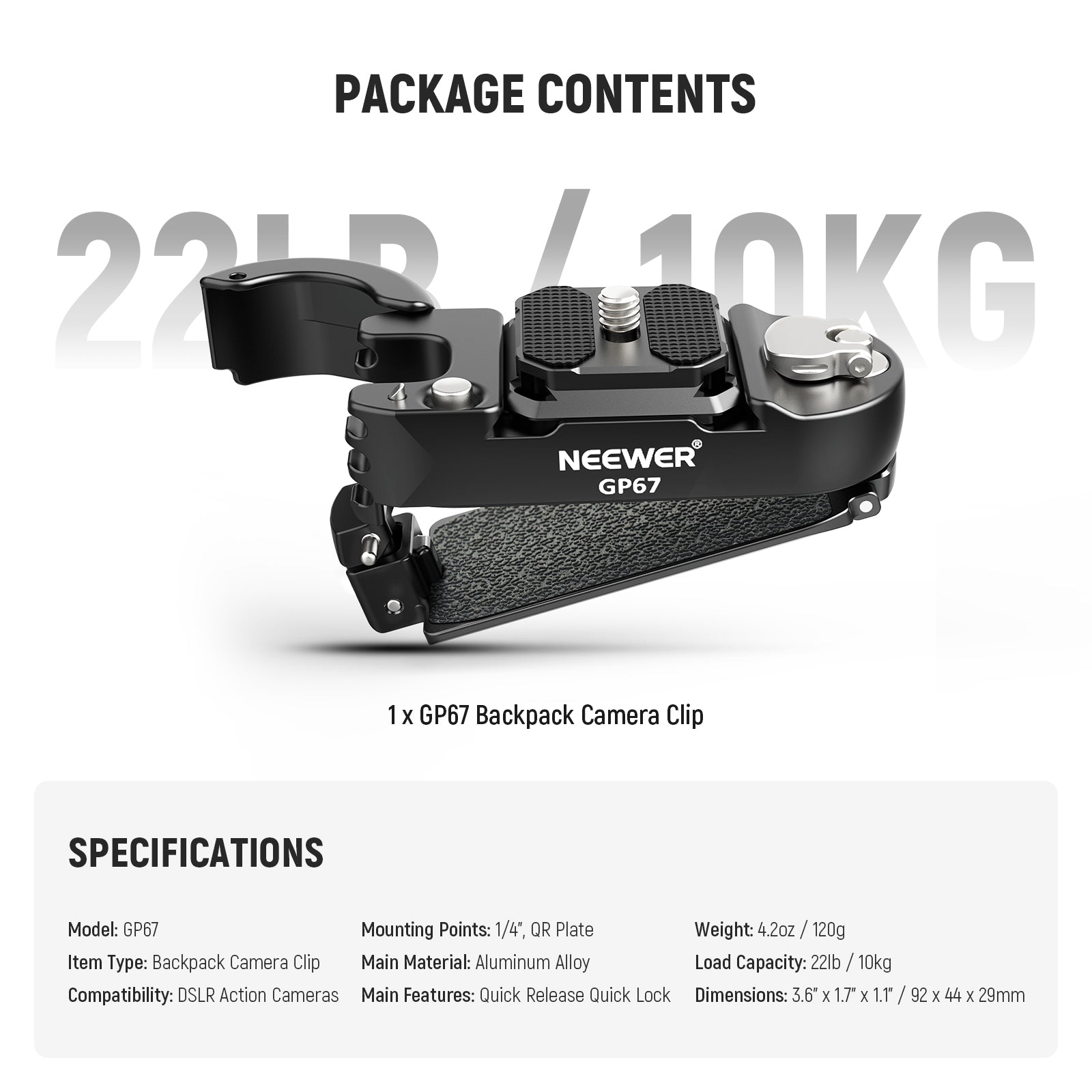 - Aluminum Alloy Build- Crafted from black anodized aluminum alloy, this backpack clip weighs only 4.2oz/120g, but it is resistant to rust, dust, scratches, and impacts, and supports up to 22lb/10kg. Measuring 3.6"x1.7"x1.1"/92x44x29mm, easily slips into your pocket for photography on the go as content creator essential and influencer must have