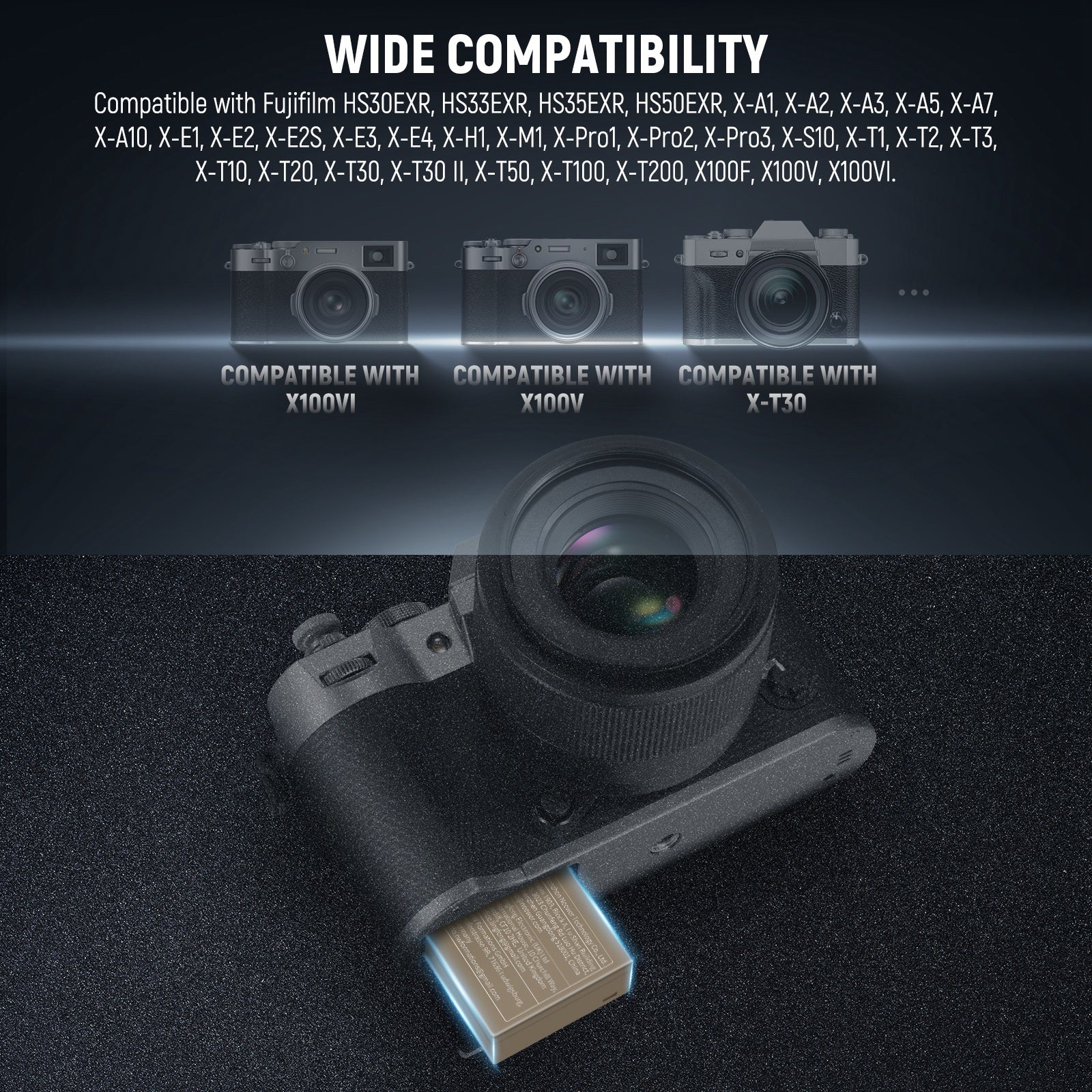 - Versatile Compatibility- Compatible with Fujifilm cameras that use NPW126 and NPW126S batteries, including HS30EXR, HS33EXR, HS35EXR, HS50EXR, X-A1, X-A2, X-A3, X-A5, X-A7, X-A10, X-E1, X-E2, X-E2S, X-E3, X-E4, X-H1, X-M1, X-Pro1, X-Pro2, X-Pro3, X-S10, X-T1, X-T2, X-T3, X-T10, X-T20, X-T30, X-T30 II, X-T100, X-T200, X100F, X100V, X100VI. Note: Fully discharge the battery before charging it for the first time