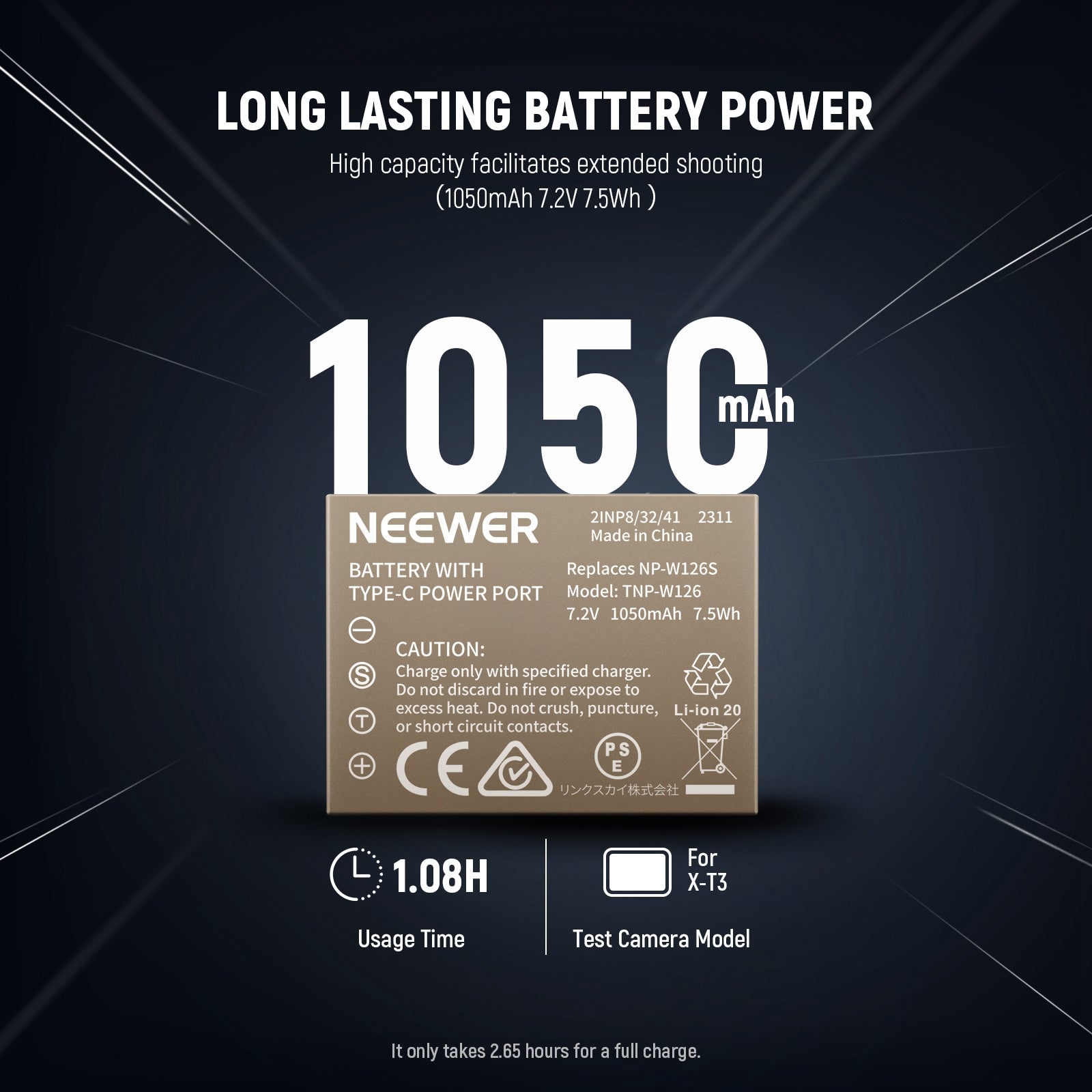 - 1050mAh Battery Capacity- With a capacity of 1050mAh, NEEWER TNP-W126 battery provides consistent and reliable power to ensure extended photo & video sessions. Free your mind from power supply worries as you capture events, landscapes, products, or portraits