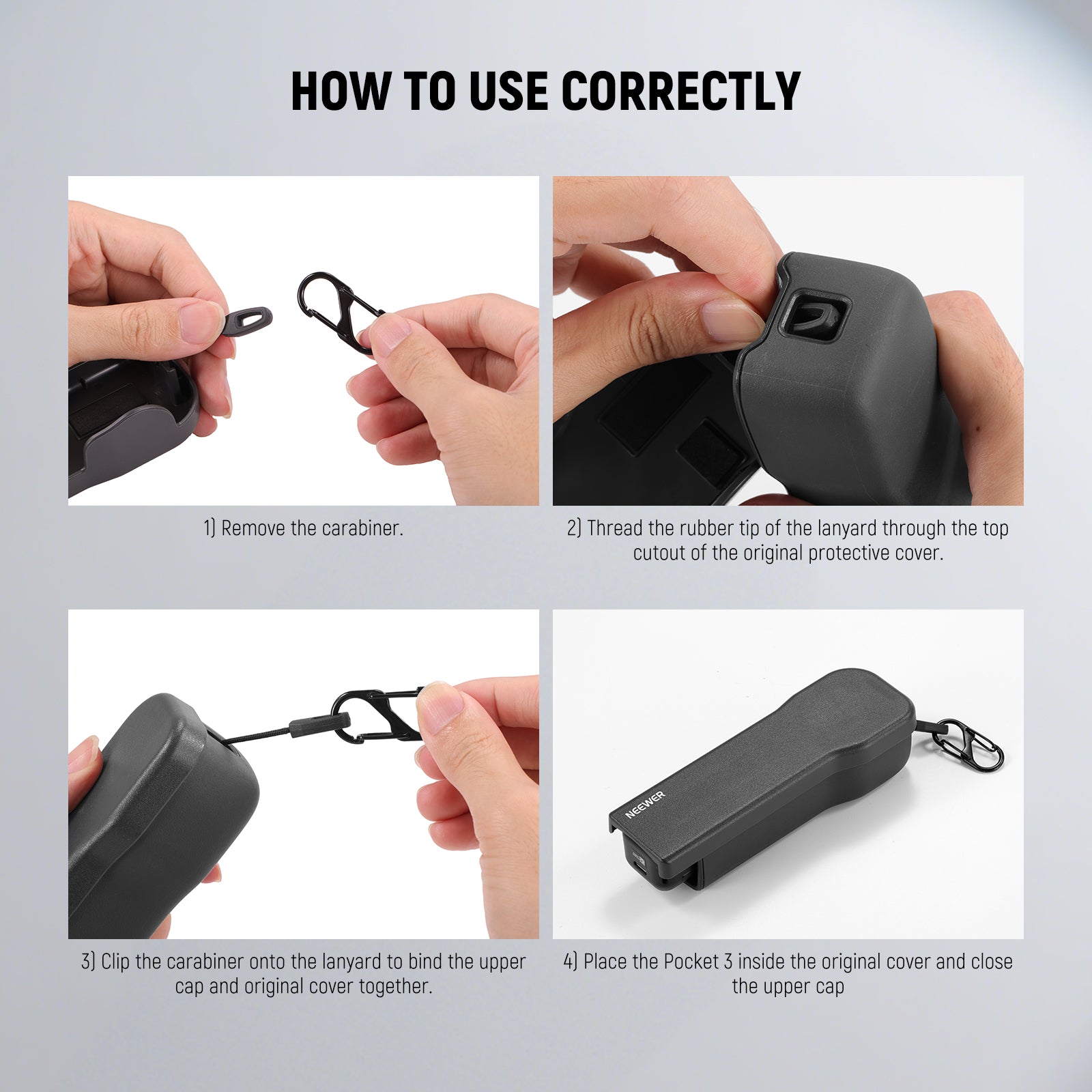 - How to Use Correctly- 1) Thread the rubber tip of the lanyard through the top cutout of the original protective cover. 2) Clip the carabiner onto the lanyard to bind the upper cap and original cover together. 3) Place the Pocket 3 inside the original cover and close the upper cap