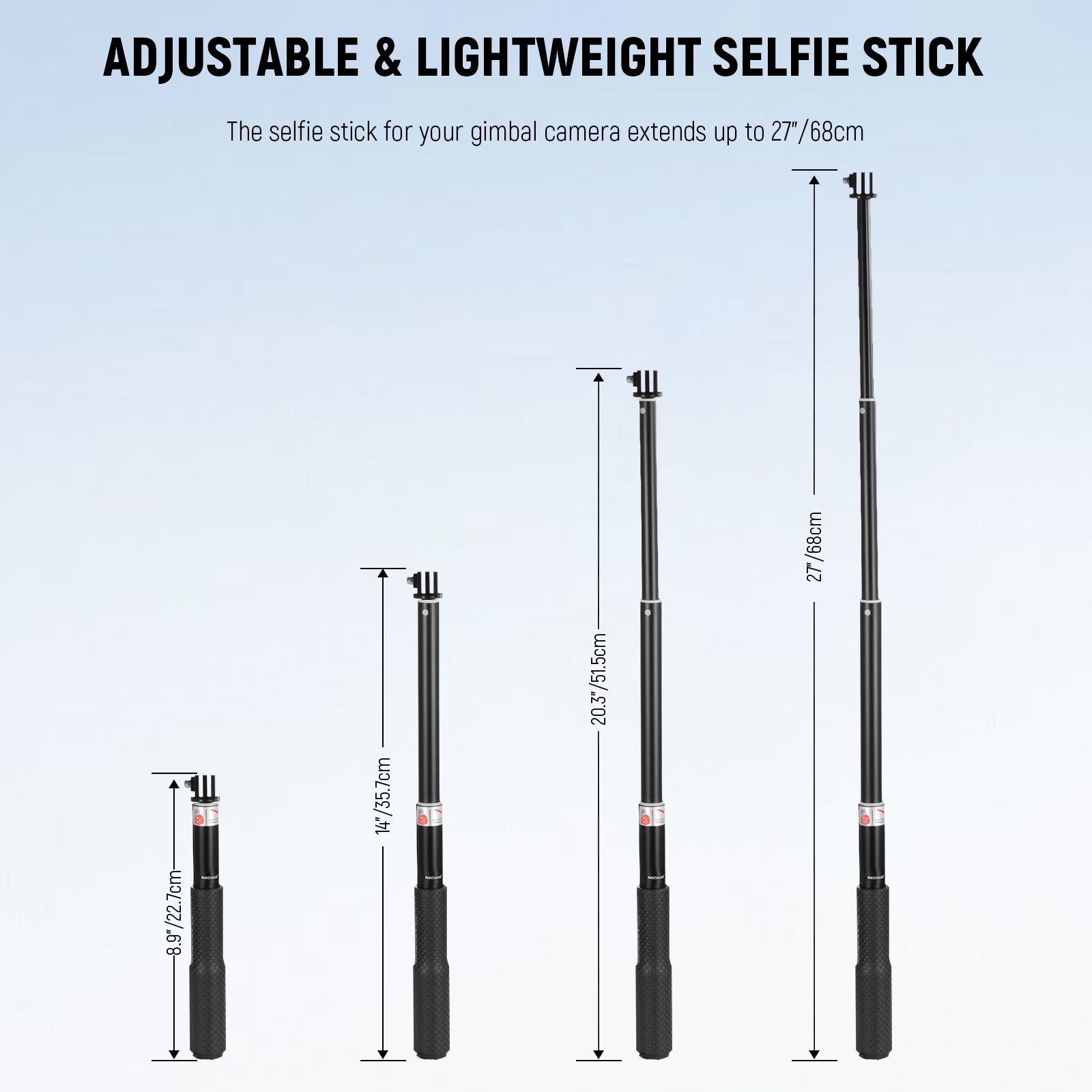 - Adjustable & Lightweight Selfie Stick- The selfie stick for your gimbal camera extends up to 27"/68cm, providing flexibility to capture wide angle shots, group photos, or dynamic action footage with ease. Lightweight and portable, this photography gear features a nonslip rubber grip for added comfort and comes with a wrist strap for enhanced safety and easy carrying