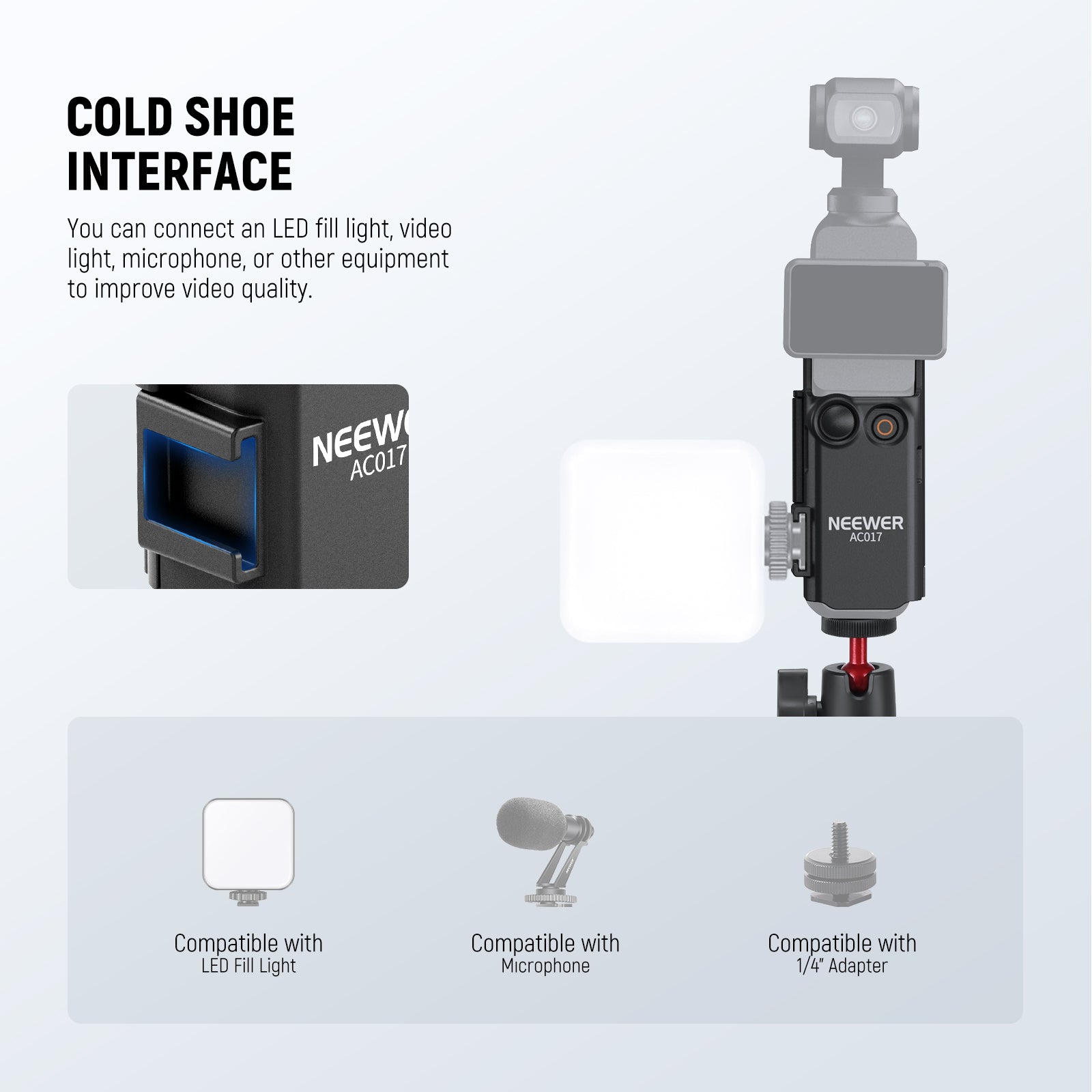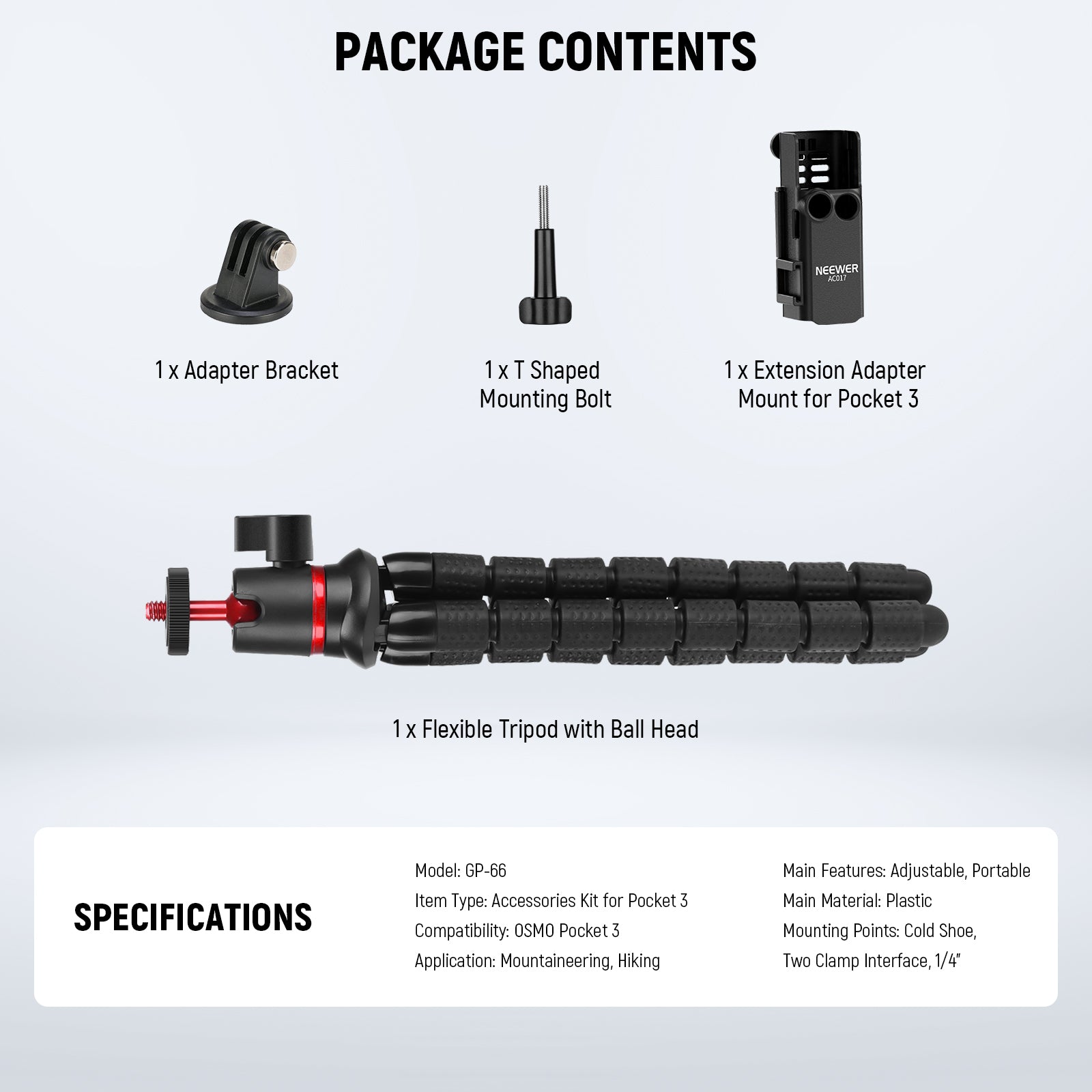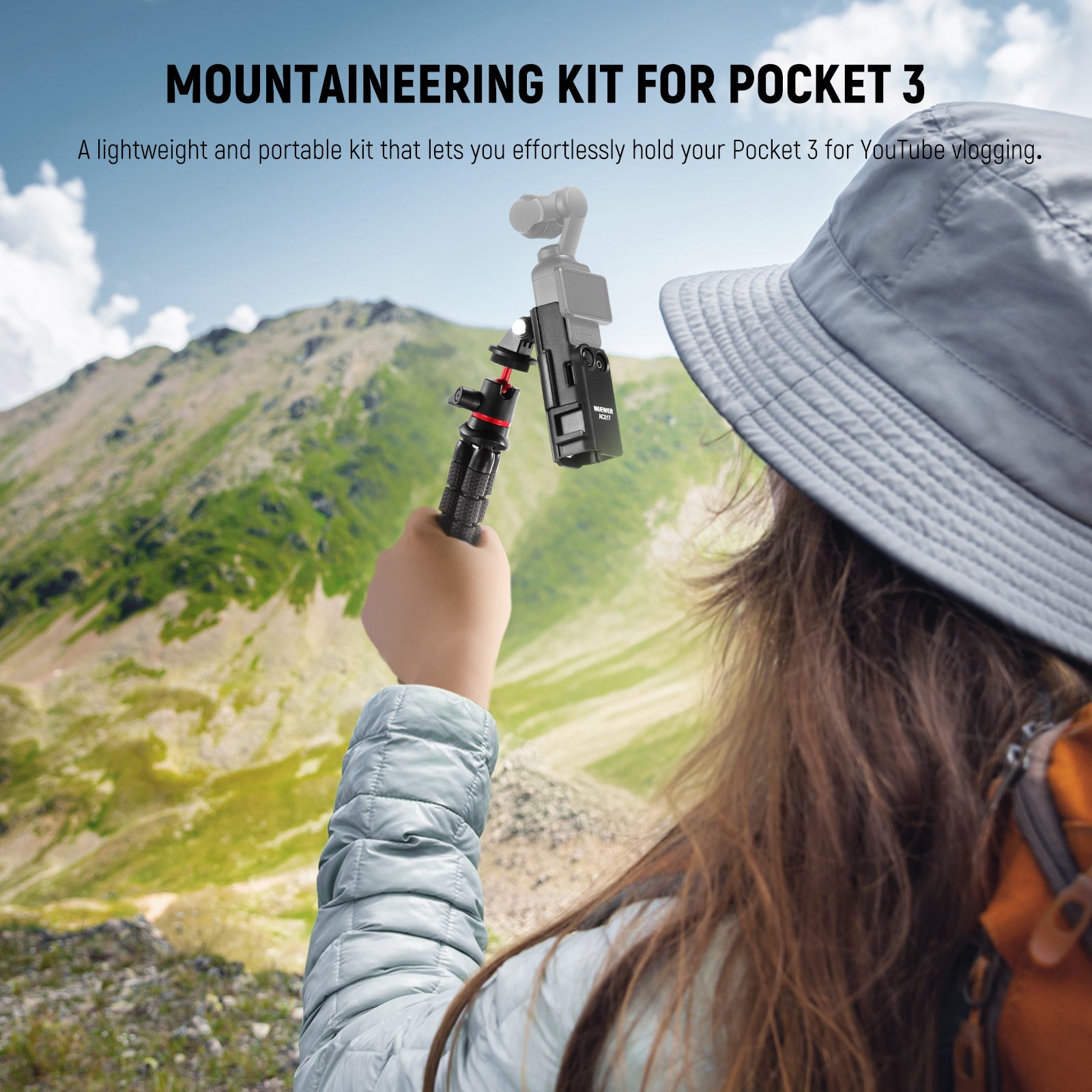 - Mountaineering Kit for Pocket- NEEWER GP-66 gimbal camera case mount accessories kit includes an extension adapter mount compatible with DJI Osmo Pocket 3 and its Creator Combo, a flexible mini tripod, an adapter bracket, and a T shaped bolt. A lightweight and portable kit that lets you effortlessly hold your Pocket 3 for YouTube vlogging, smooth video recording, selfies, and action packed vlogs during outdoor adventures like trekking and hiking