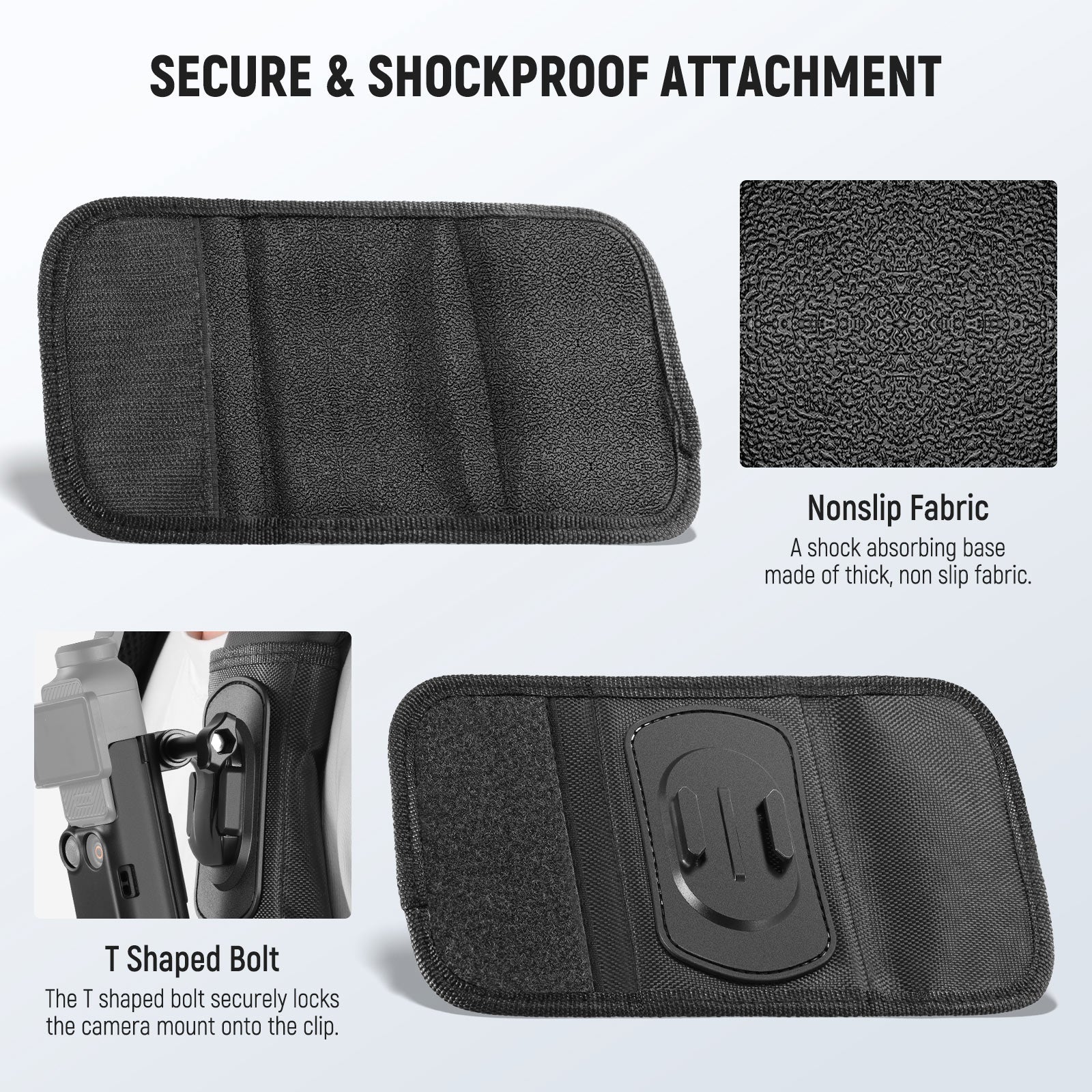 - Secure & Shockproof Attachment- The backpack strap mount features a shock absorbing base made of thick, nonslip fabric, ensuring it stays securely in place on the strap, while the T shaped bolt tightly locks the camera mount onto the clip, preventing wobbling and ensuring stable footage for premium quality photos