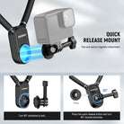 - Quick Release Locking Mechanism- A standard quick release action camera mount can instantly attach to the neck mount using magnets and lock by a 90° clockwise rotation. To unlock, press the quick release button (down arrow), then turn it 90° counterclockwise