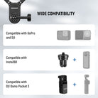 - Suitable for Most Action Cameras- The action camera mount adapter attachments are compatible with Hero 13 12 11 10 Go Pro 9 Black Max; compatible with DJI Action 5 Pro/4/3/2; compatible with Insta 360 X5/X4/X3 Ace Pro; compatible with AKASO Brave 8 7 4 Combos, and more. A camera cage rig for Osmo Pocket 3 is included for hands free shooting as content creator essential body mount pack, influencer must have photography gear and accessories kit