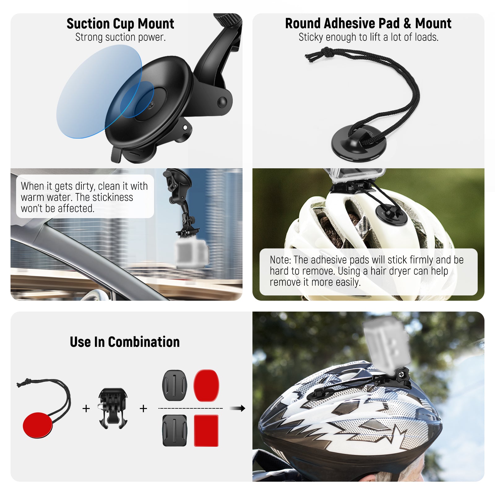- Straps for Head, Chest & Helmet- Adjustable straps fit different head sizes and body shapes. They help you capture immersive POV shots during extreme sports, such as surfing, skateboarding, parachuting, and bungy jumping. The helmet strap attaches the action camera to a helmet for road biking, mountain biking, and BMX racing