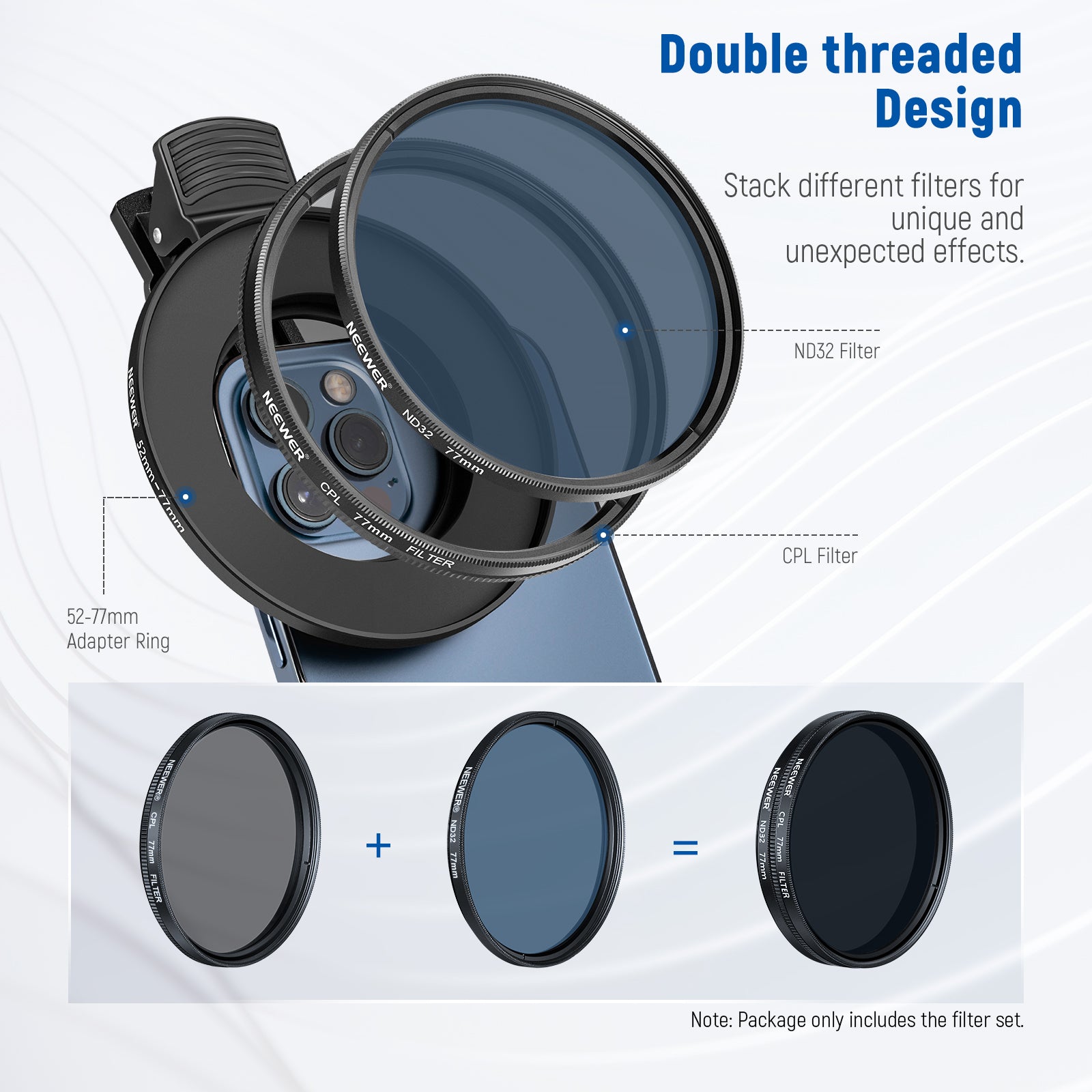 - Neutral Density Filter- The ND32 filter reduces 5 stops of light entering the camera sensor without changing the color. It allows you to use a slower shutter speed for creative photos or a wider aperture for shallower depth of field