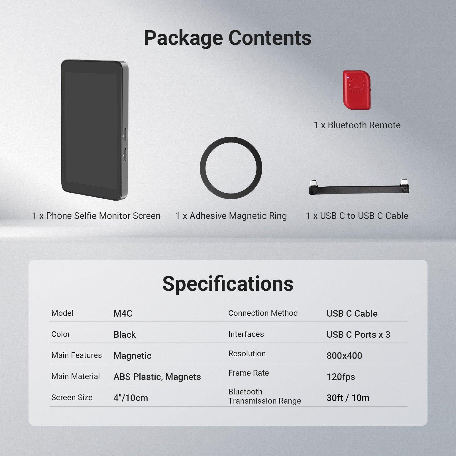 - 3 USB C Ports- For screen mirroring, microphone connection, and power delivery to phone when connected to an external power source, this magnetic mini selfie monitor screen compatible with iPhone & Android phones is portable for on the go vlogs and travel films
