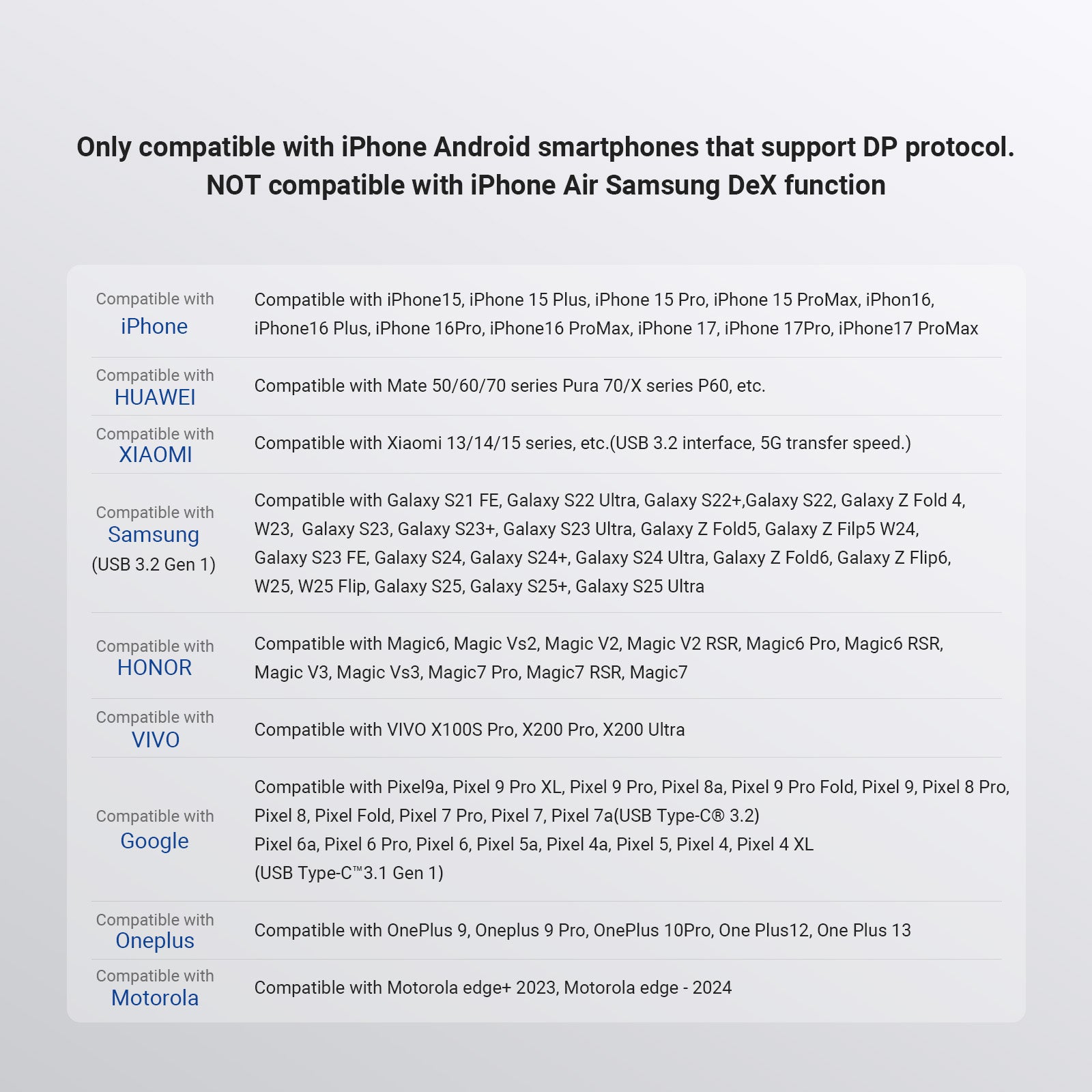 - Magnetic Attachment- The mini back camera mirror monitor as phone vlog filming accessories ensures secure attachment for stable video recording and photography, only compatible with iPhone Android smartphones that support DP protocol. NOT compatible with iPhone Air Samsung DeX function