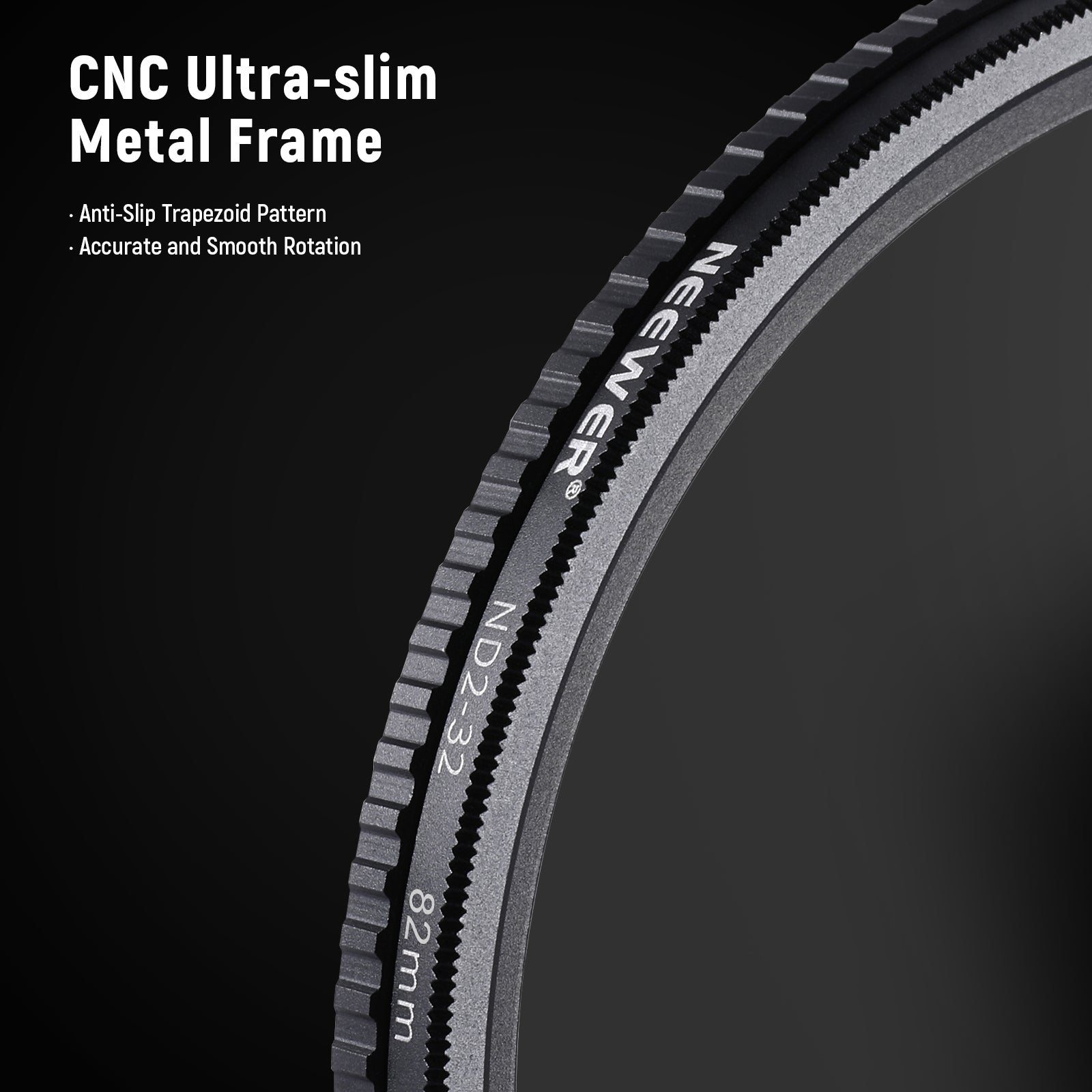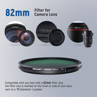 - Variable ND Filter- With variable neutral density from 2 to 32, this ND filter reduces the light that enters the lens in 1-5 stops, enables you to control exposure in various light conditions, and shoots with slower shutter speeds and wider apertures for creative motion blur. Ideal for taking images and videos of rivers, waterfalls, the sea, fountains, traffic trials, and other moving subjects.