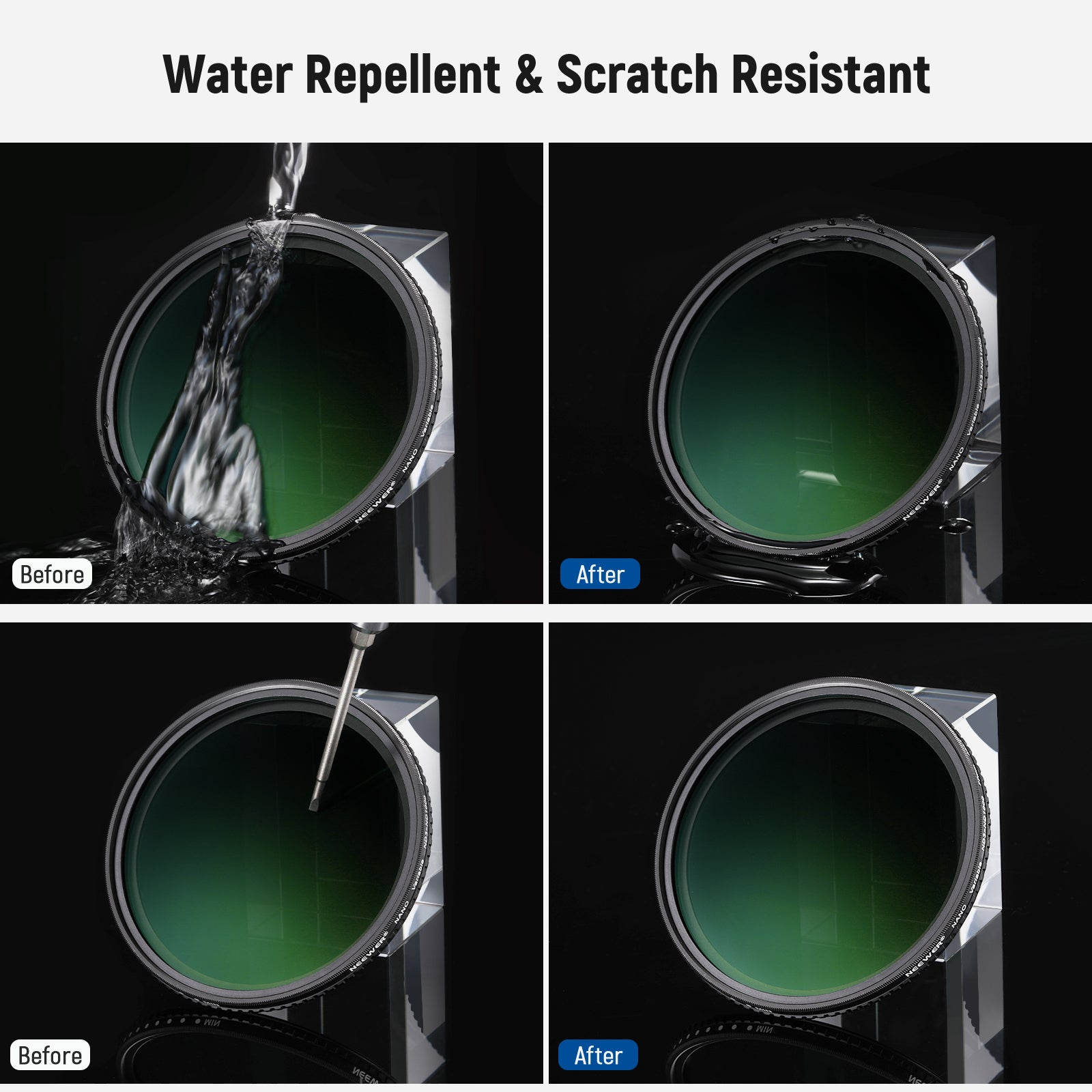- Variable Neutral Density Filter- With ND3-ND1000 wide neutral density range, the variable ND filter helps handle various light conditions with ease. From overcast to bright sunny days, simply rotate the filter ring to adjust the amount of light that enters your camera lens to avoid overexposure
