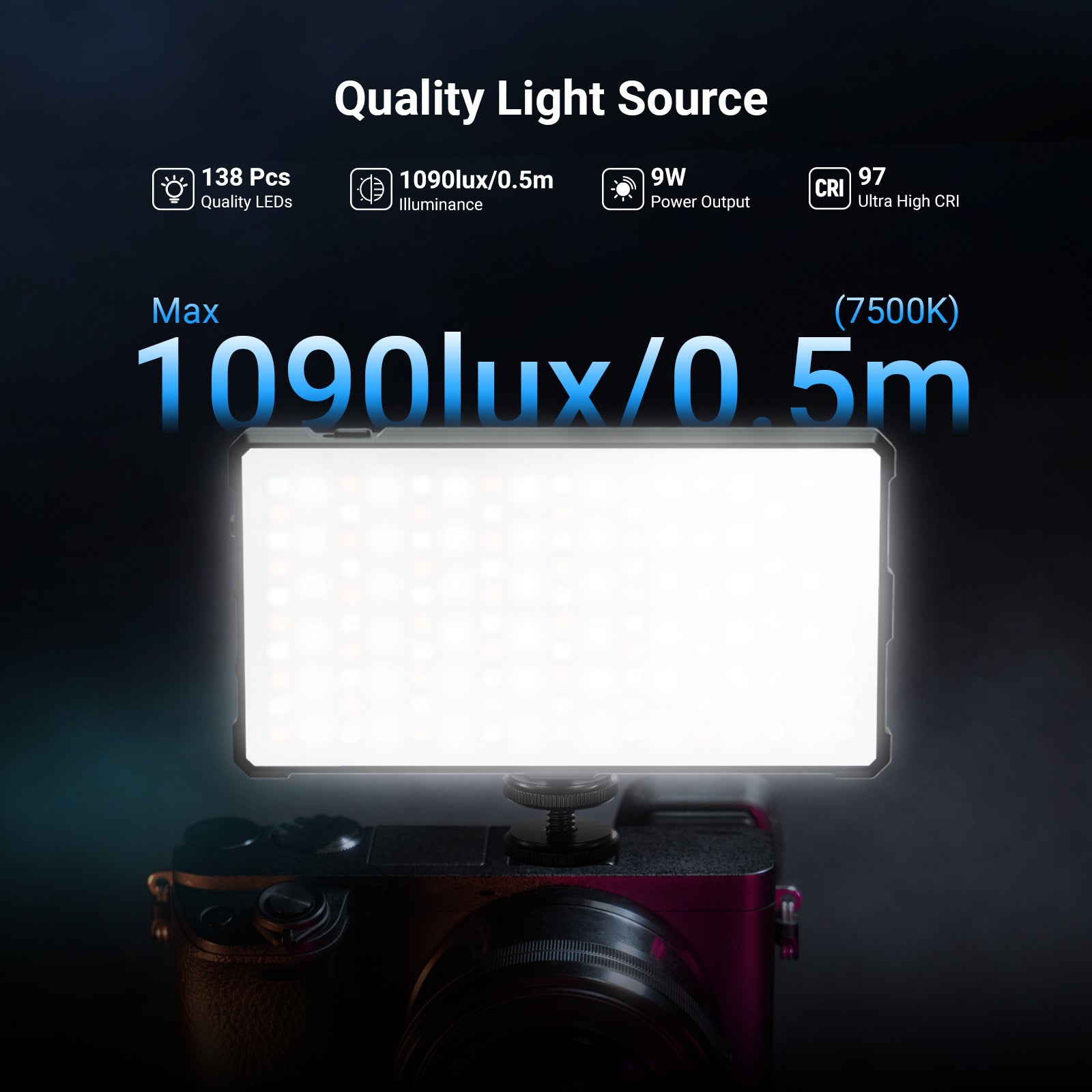 - Full Color Camera Light with CCT/HSI/FX- Featuring 45 warm, 45 cool, and 48 RGB LED blended, this on camera light delivers up to 984lux/0.5m with 3 lighting modes: CCT/HSI/FX. In CCT mode, it offers color temperature range from 2700K-7500K with stepless brightness control from 0-100%. HSI mode enables full spectrum color output with 360° H selection for rich, customizable tones, while FX mode provides 17 dynamic scene effects that simulate real world scenarios to enhance visual storytelling