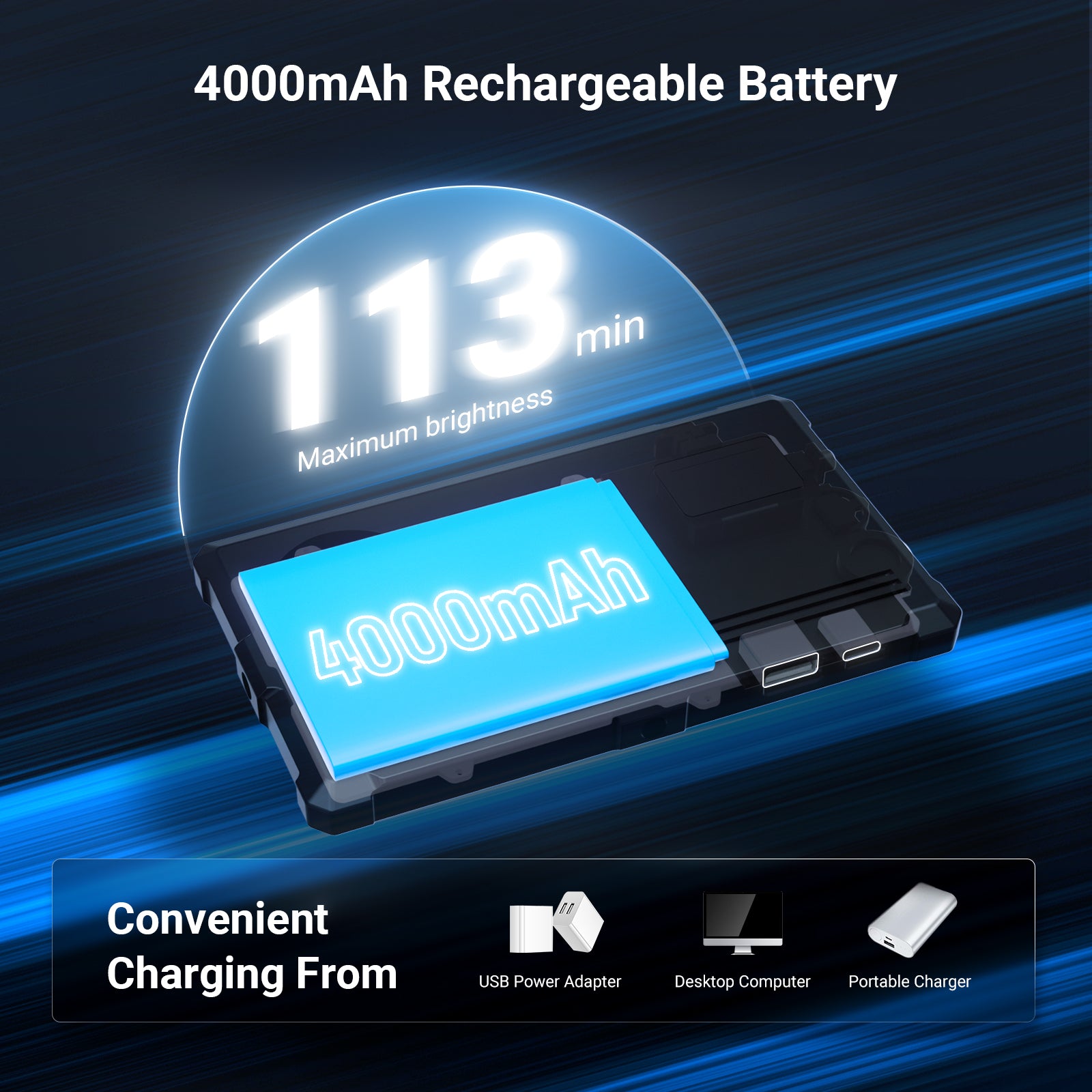 - 4000mAh Rechargeable Battery- The built in 4000mAh lithium battery powers the light for up to 113 minutes at full brightness and easily recharges via car charger, laptop, or other USB power sources with the included cable. A USB output port is also available, allowing the light with high capacity battery to double as a portable charger for your smartphone or tablet. NOTE: For optimal battery longevity, please fully charge the device before first use