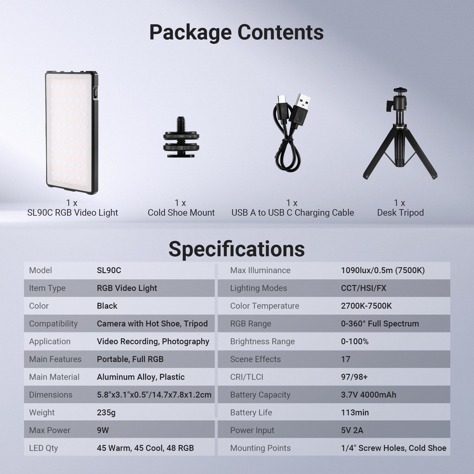 - 1 x SL90C RGB Video Light