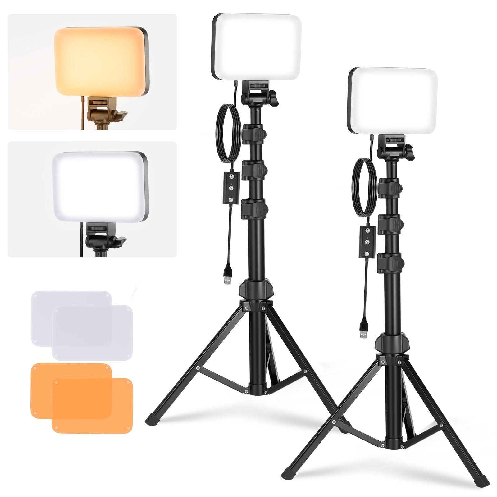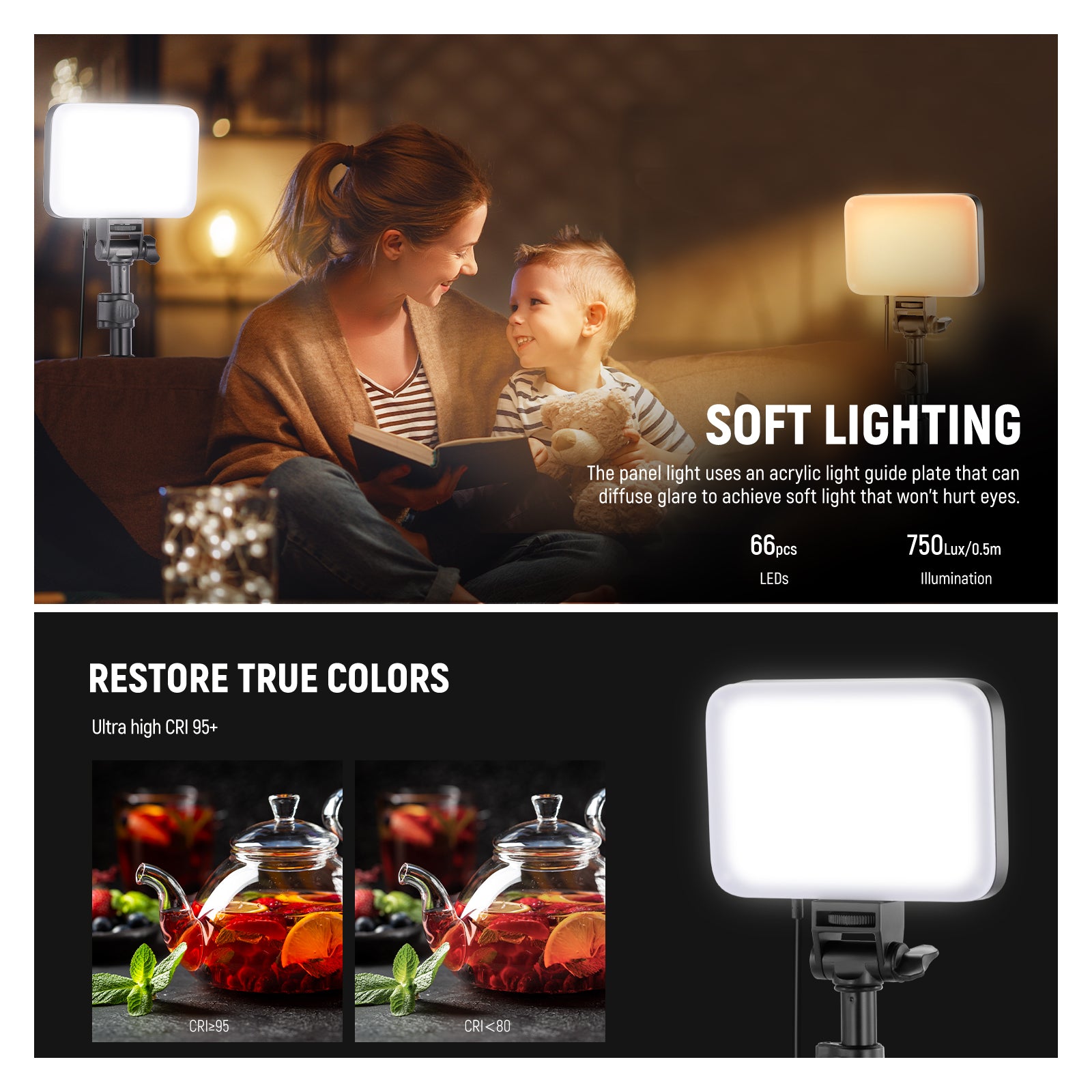 - LED Panel Video Lighting Kit- With 66 LEDs, NEEWER 10W studio panel light equipment offers 750lux illumination at 0.5m (with color filter attached), 3200K and 5600K bi color temperature, CRI>95. A portable photography tripod light stand and 4 color filters included, for makeup lash (eyelash) artist, esthetician, tattoo, barber, selfie photos, Tiktok/YouTube social media video recording, podcast, Facetime, Zoom call, video conference, live streaming, vlogging, filming, camera photoshoot
