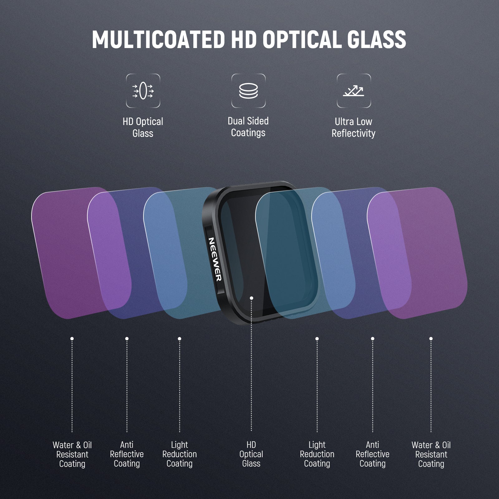 - Outdoor Exposure Balance- The ND16 neutral density filter for action camera lens reduces light by 4 stops to prevent overexposure in outdoor shooting and lets you capture waterfalls, rivers, light trails, and other moving subjects with a motion blur effect