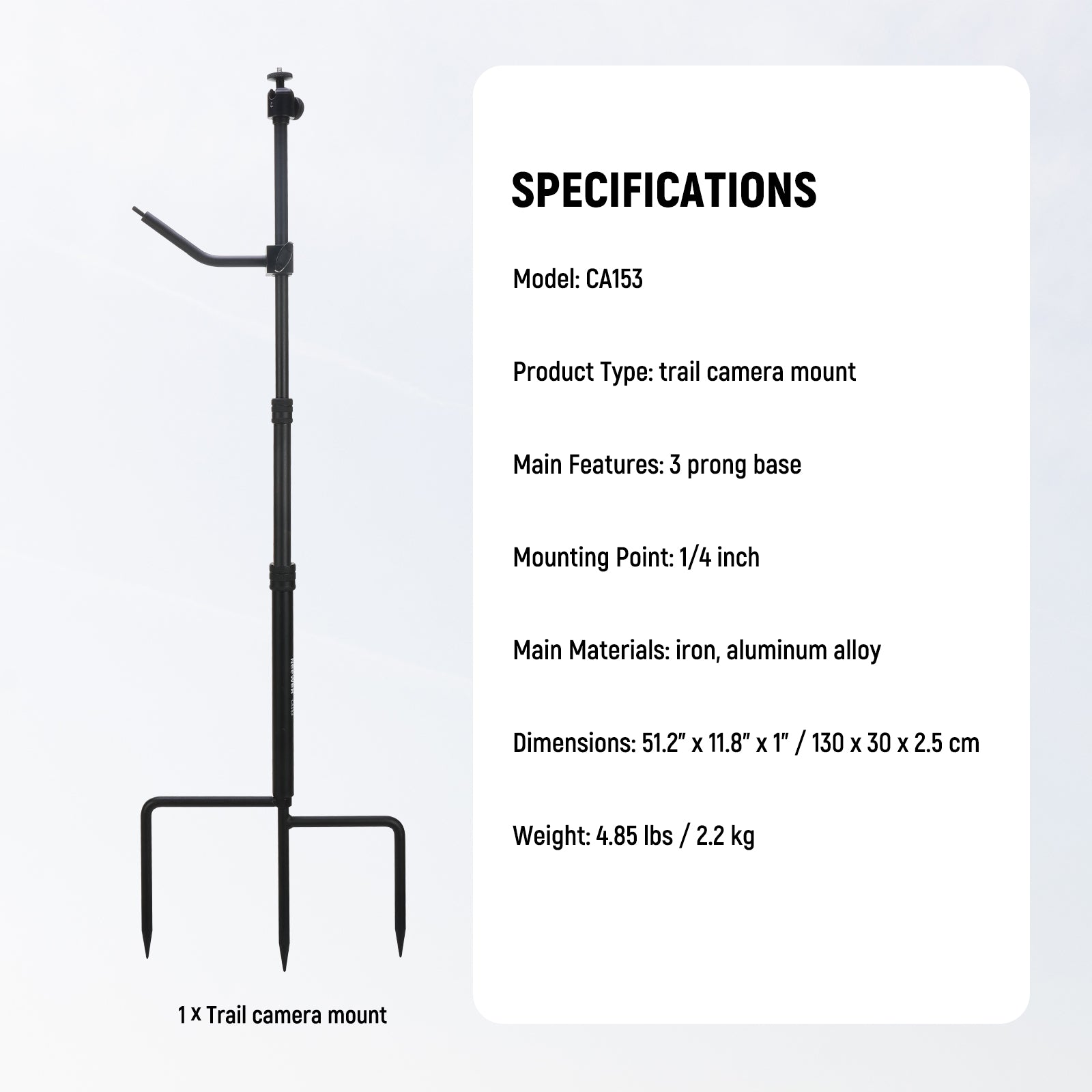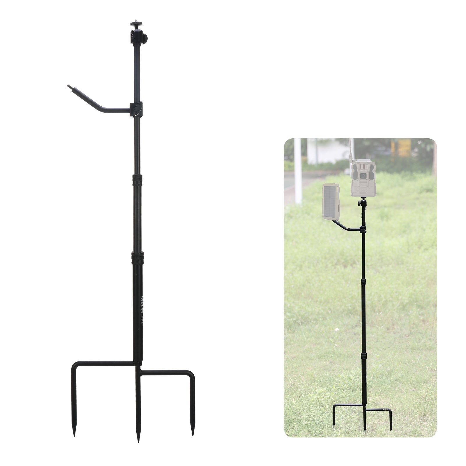 - 3 Prong Trail Camera Mount Stand- The camera stake mount consists of a three pronged base, a side arm, and two ball heads, to secure your trail camera and solar panel among hedges, shrubs, or on the surrounding ground, to capture dynamic hunting scenes, compatible with Moultrie Mobile Edge cellular trail cameras compatible with Bushnell trail cameras compatible with TACTACAM Reveal cameras and more via the 1/4" screws