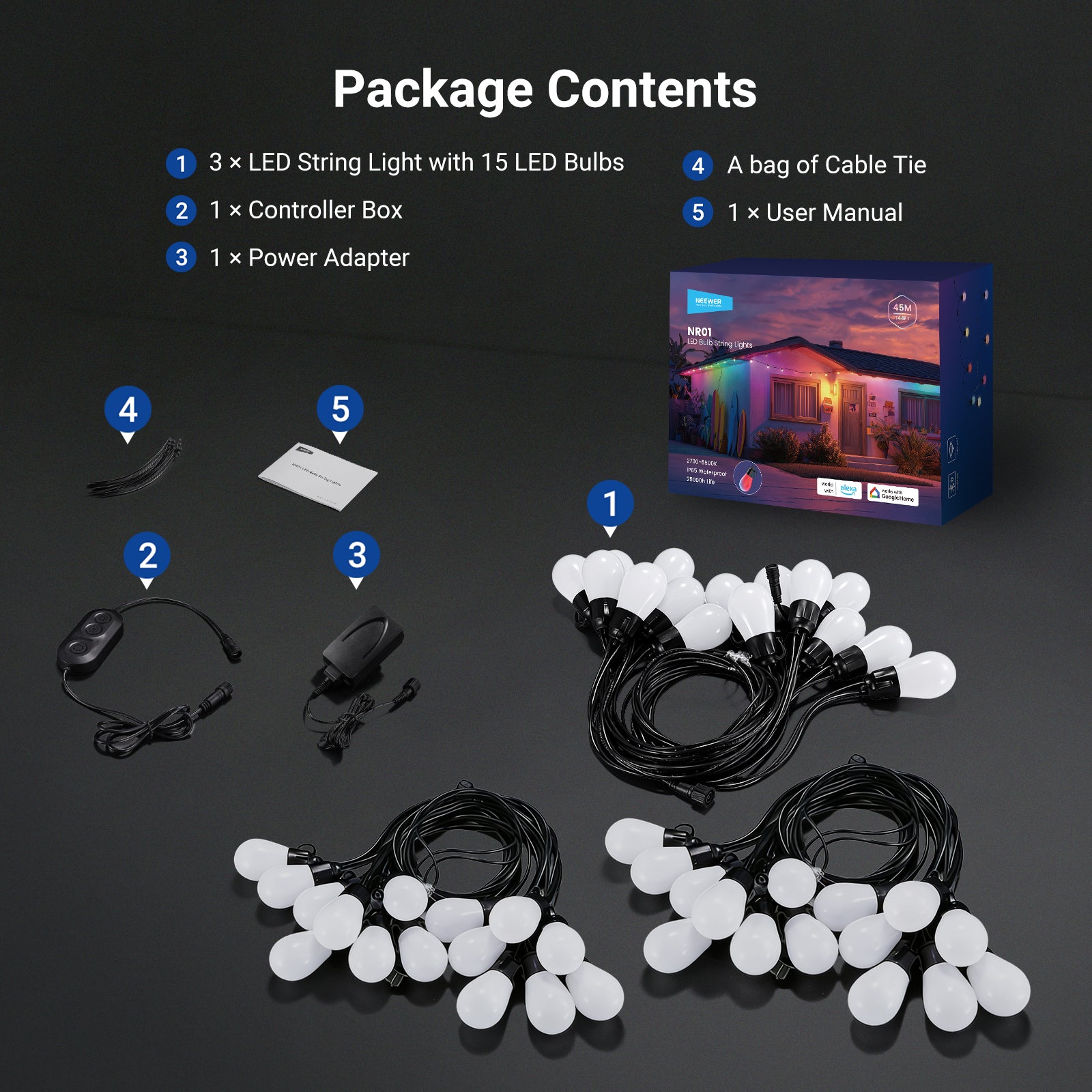 - Fascinating RGBW Effects & Individual Control- Each led string features 15 dimmable RGBW bulbs (2700K-6500K, up to 80lm per bulb) for a soft glow and warm cozy ambience. Each bulb can be set to different colors. RGB lighting for Christmas, holiday patios decoration, gazebos, terraces, pergolas, backyard, apartment out door balcony, outside bistro/cafe/bar, yard, deck, or as permanent outdoor light products for house, camper camping, indoor bedroom classroom dorm party waterproof decor, etc