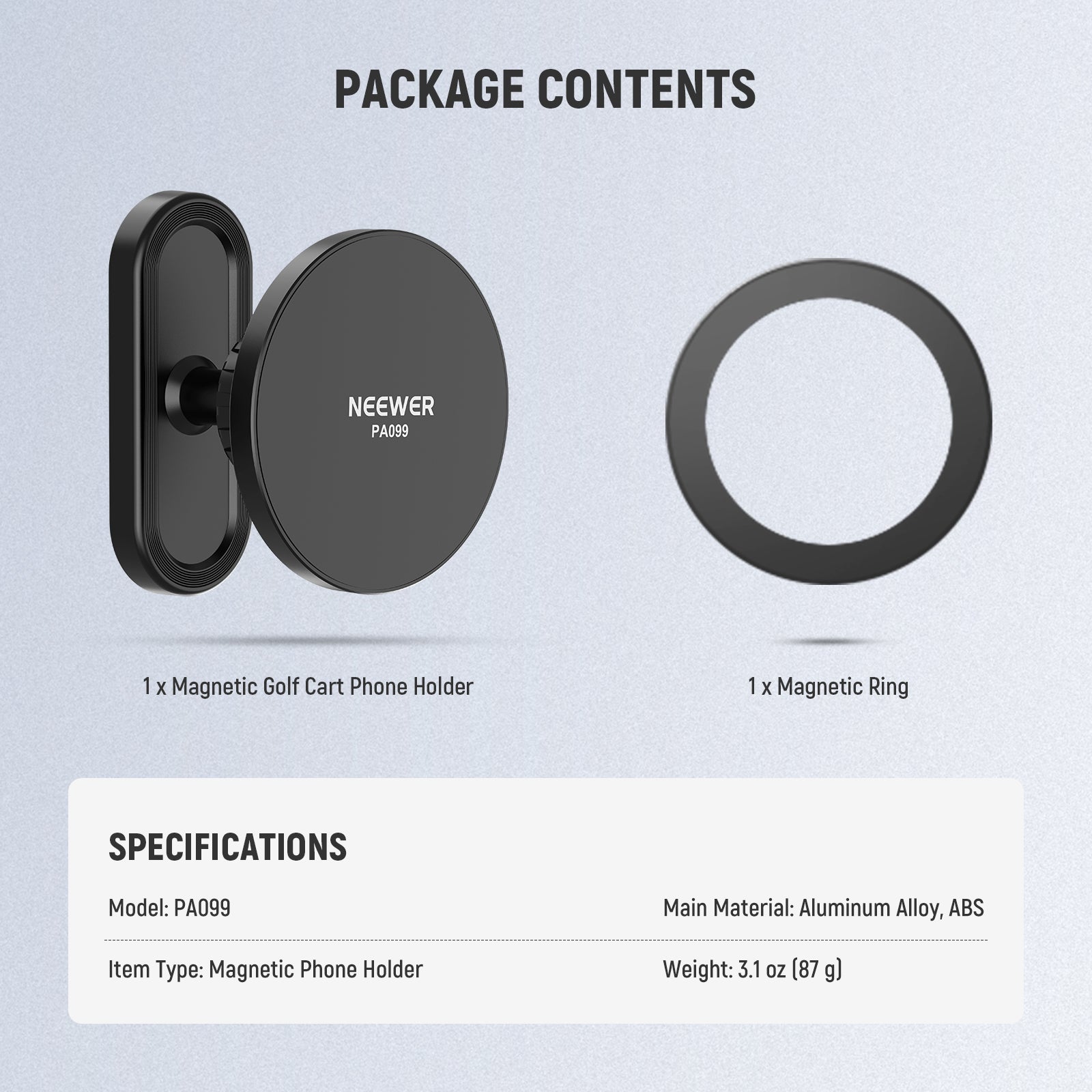 - Magnetic Phone Attachment- The golf cart phone holder is compatible with MagSafe system, and compatible with iPhone 17 16 15 Pro Max Plus 14 13 12 series, the Mag Safe compatible phone case covers and NEEWER PA143 PA144 PA073 PA074 PA023 PA024 cages for iPhone 1716 15 Pro and Pro Max. For non MagSafe phones, use the included magnetic ring for compatibility with Samsung Galaxy S25 S24 S23 Ultra Google Pixel 9 Pro Huawei, and more as phone camera photography accessories